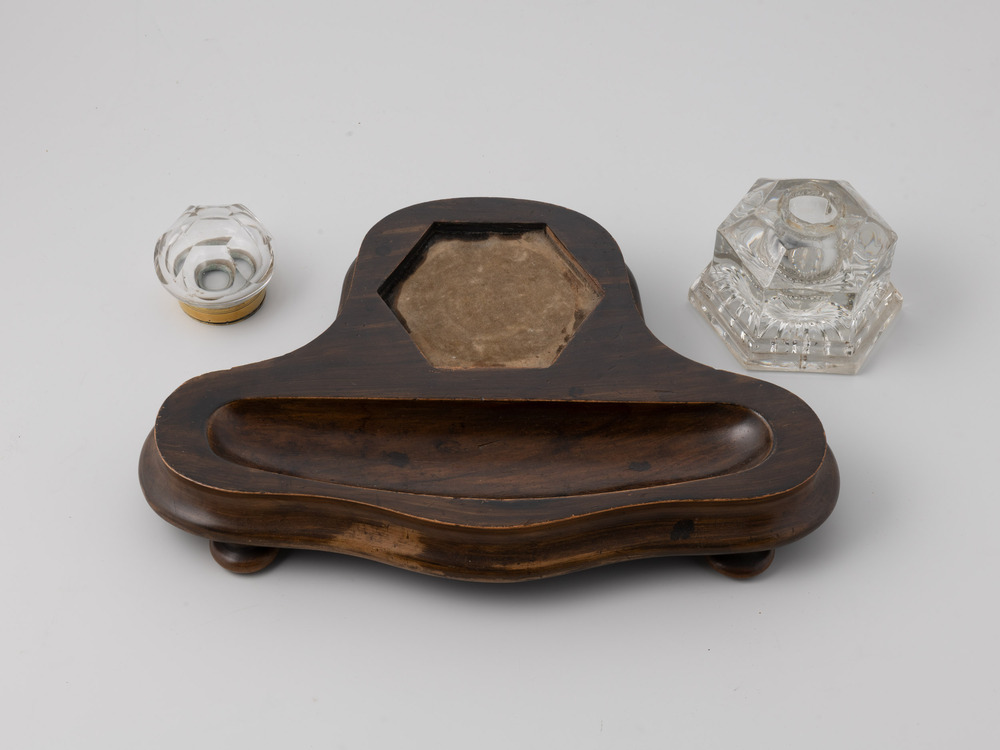 Inktstel met houten onderstel en kristallen inktpot