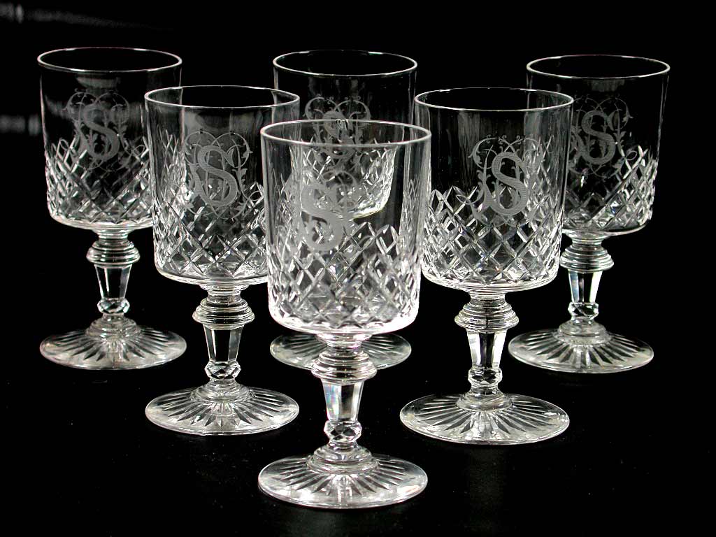 Karaf en glazen van kristal (een van zes rode wijngl...