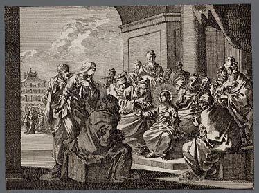 Het kind Jezus wordt bij de ingang van de tempel doo...