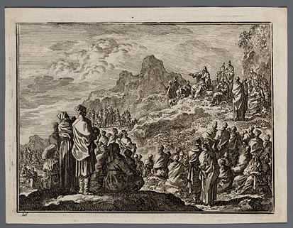Jezus, gevolgd door een grote menigte, predikt in de...