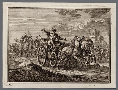 Joram op zijn wagen wordt door Jehu doorschoten