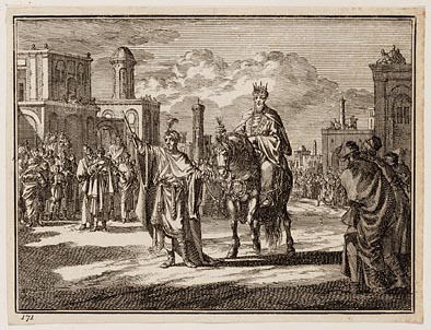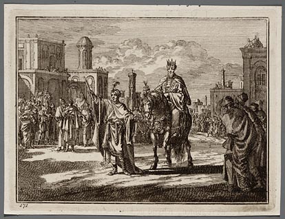 Mordechai in koninklijk gewaad te paard door de stad...