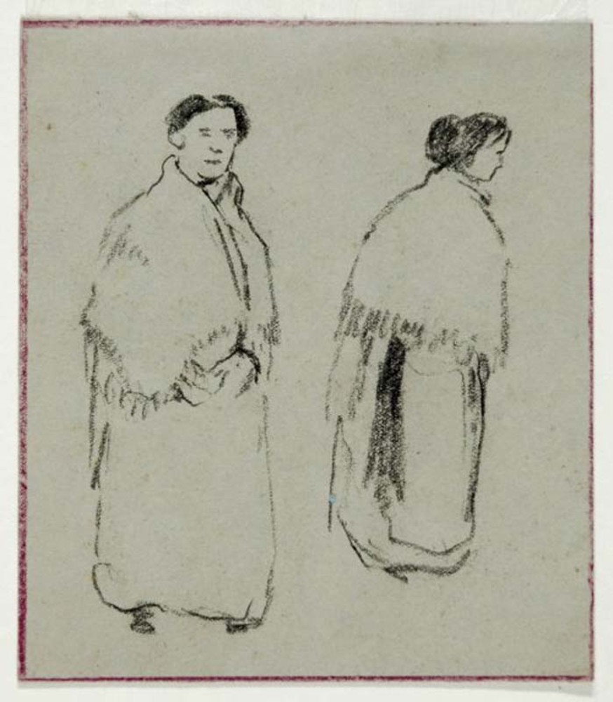 Figuurstudie van twee vrouwen met omslagdoeken op de...
