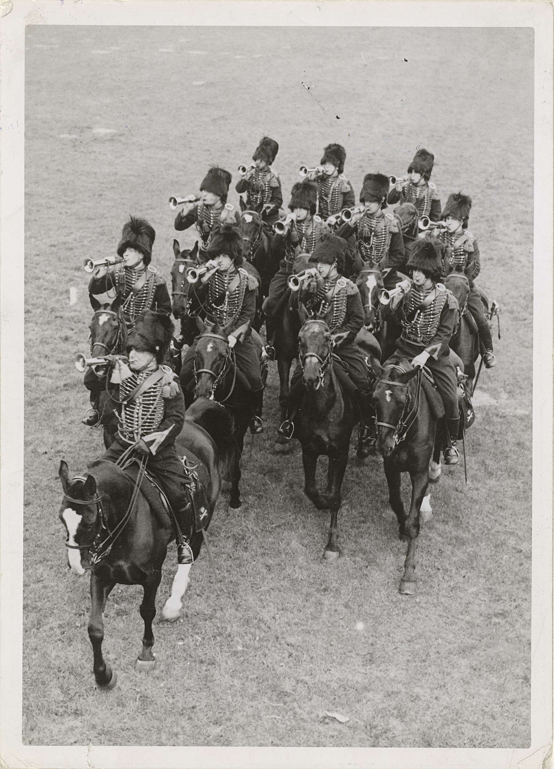 Ruiters van het Korps Rijdende Artillerie met trompe...