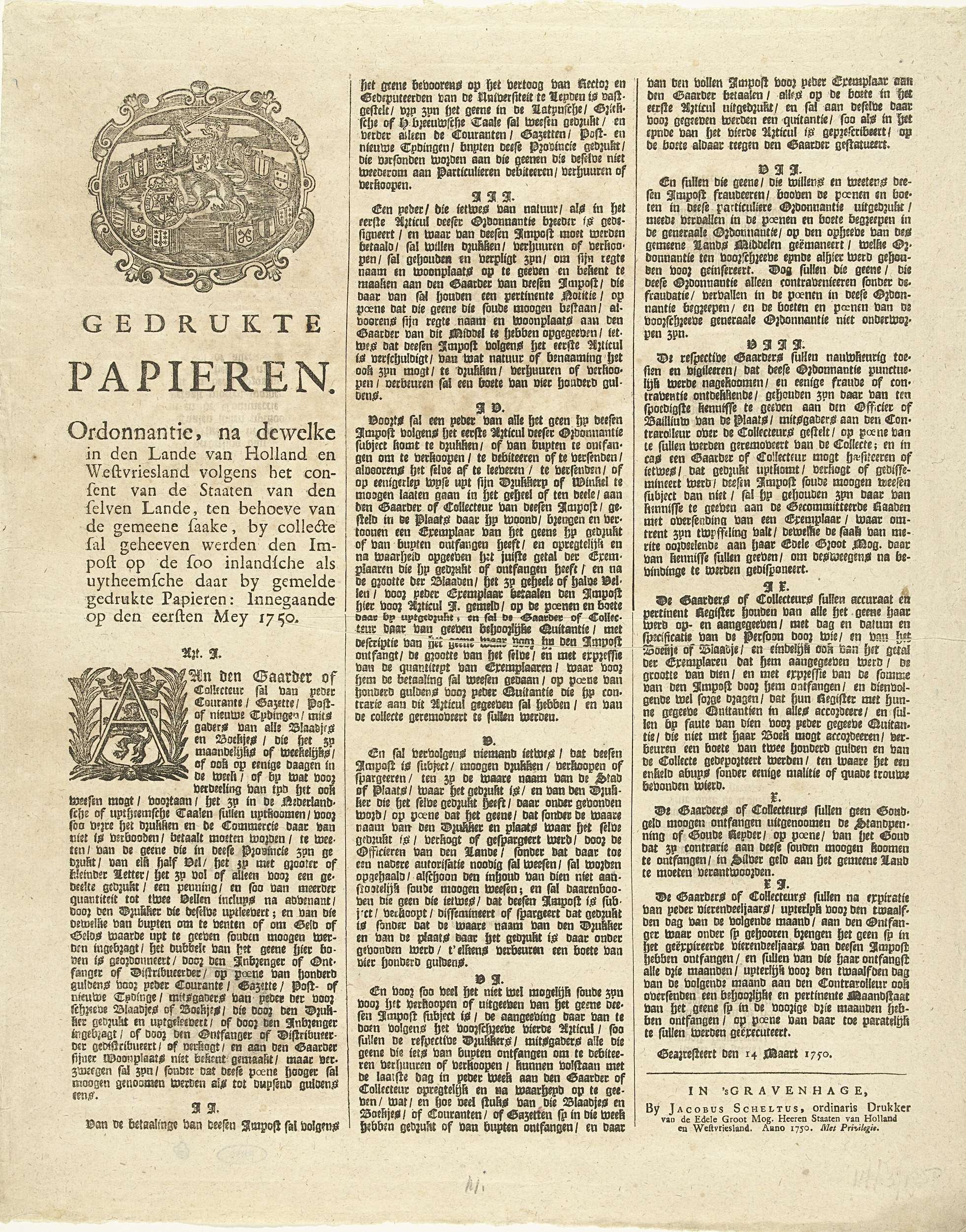Ordonnantie van een impost op gedrukte papieren, 1750