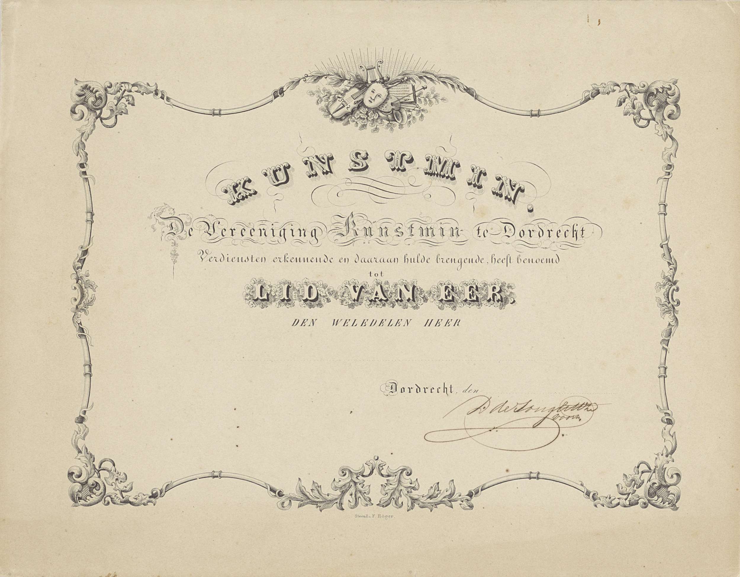Lidmaatschapsbewijs Vereniging Kunstmin te Dordrecht