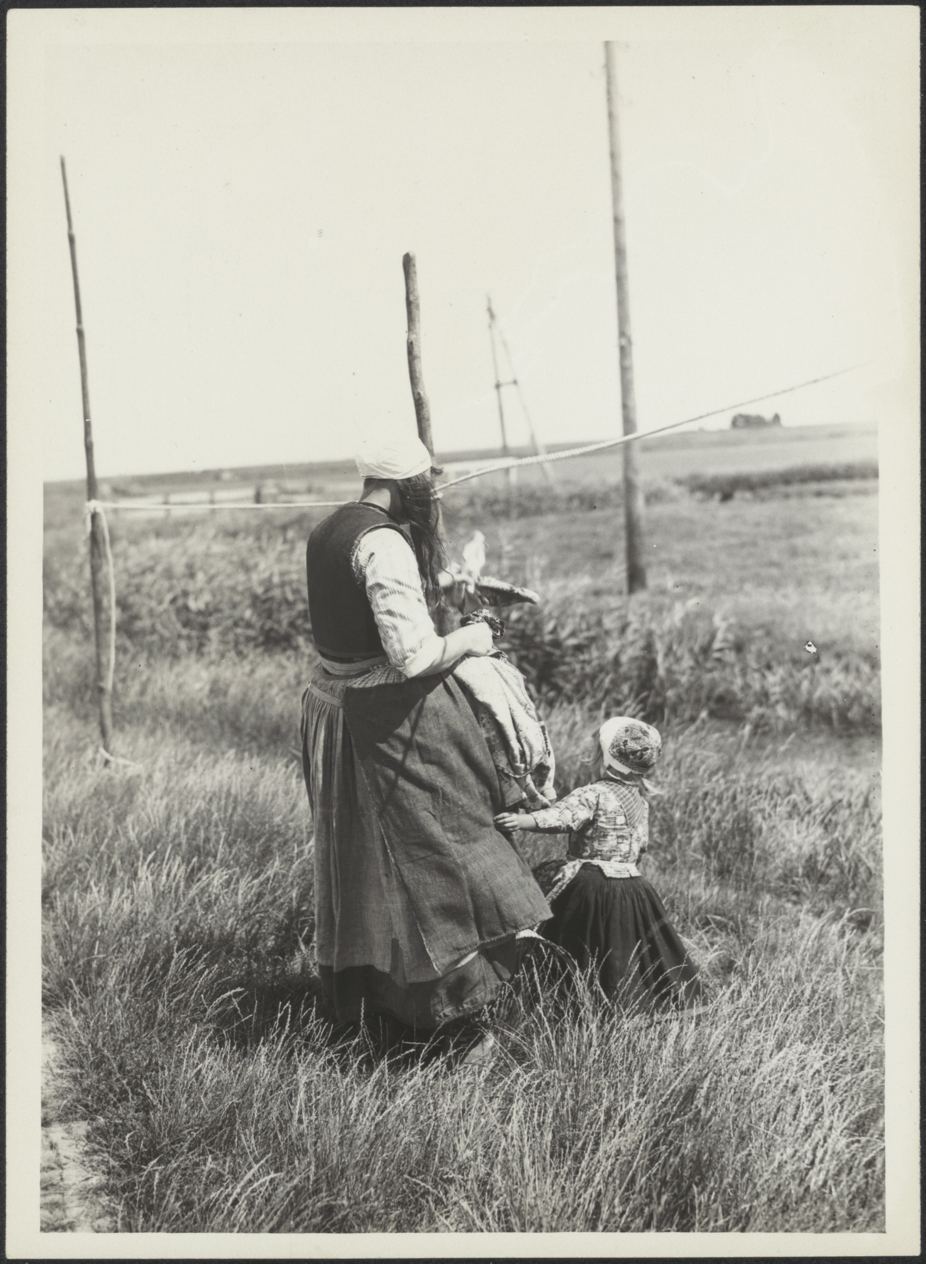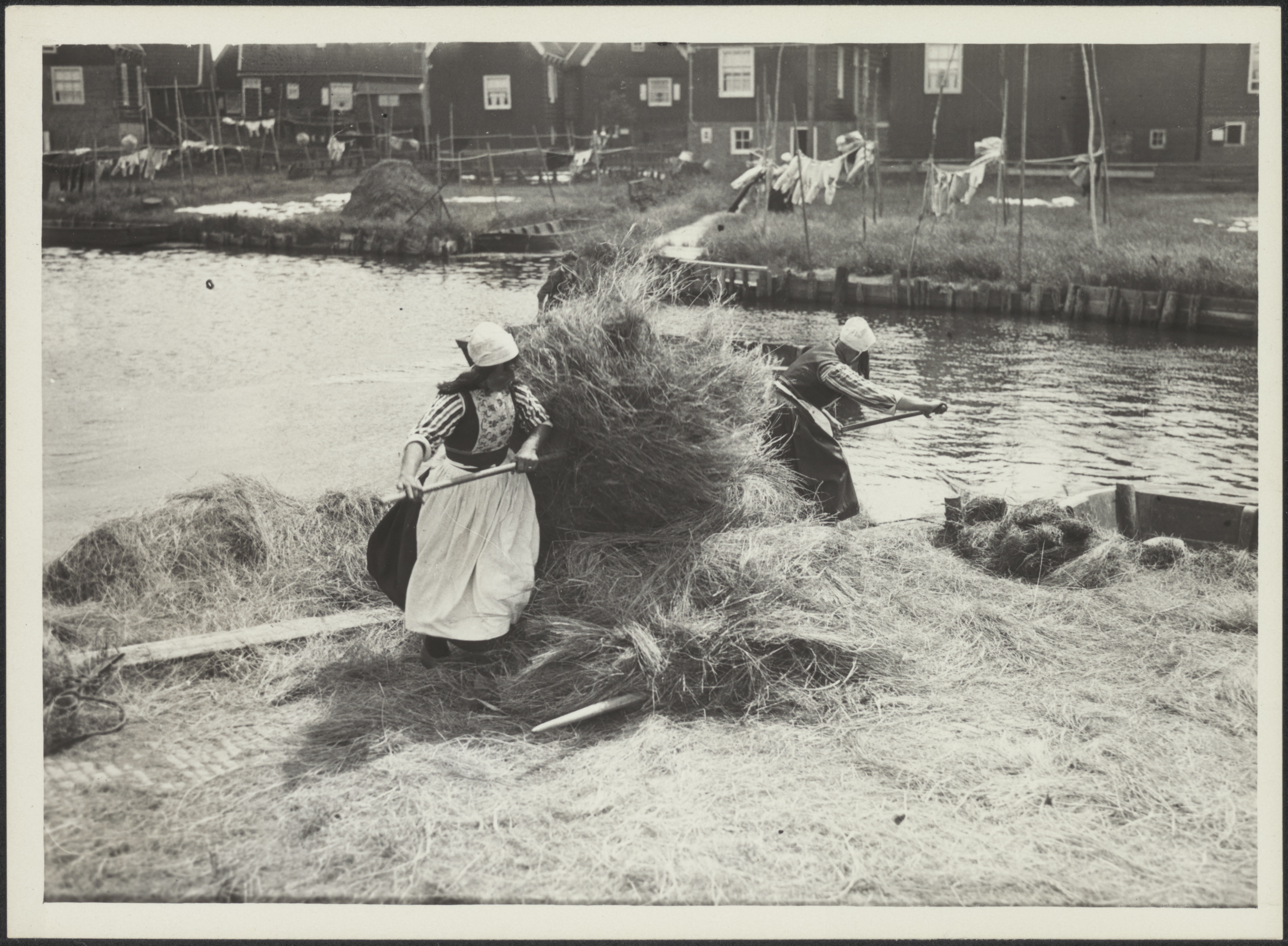 Marker vrouw met kind aan het hooien