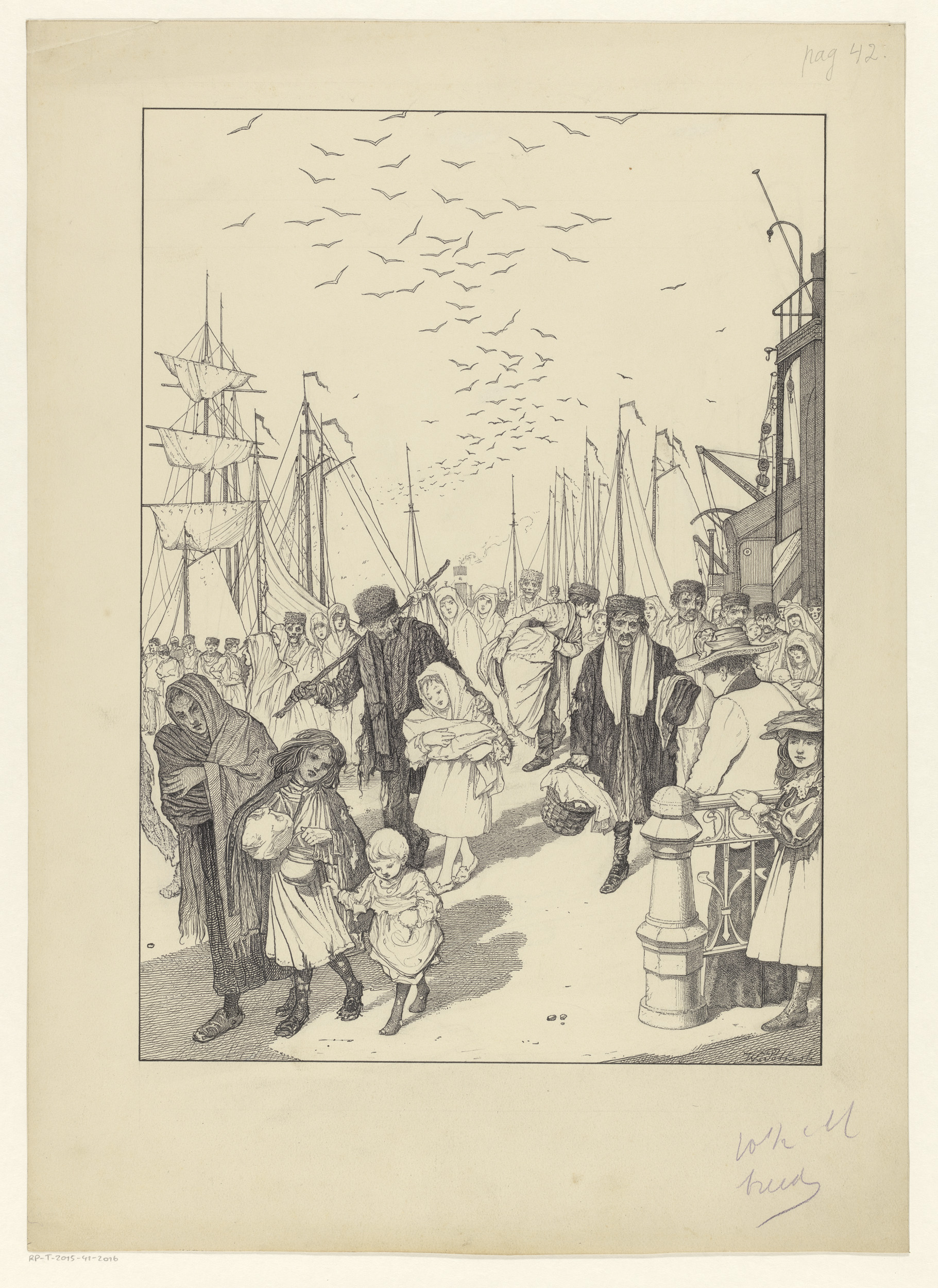 In lompen geklede figuren op een kade