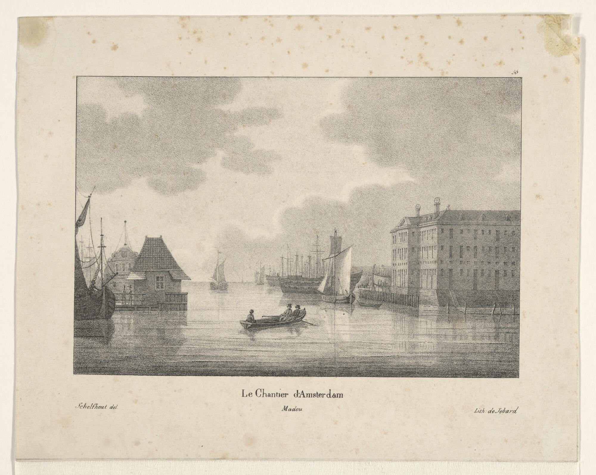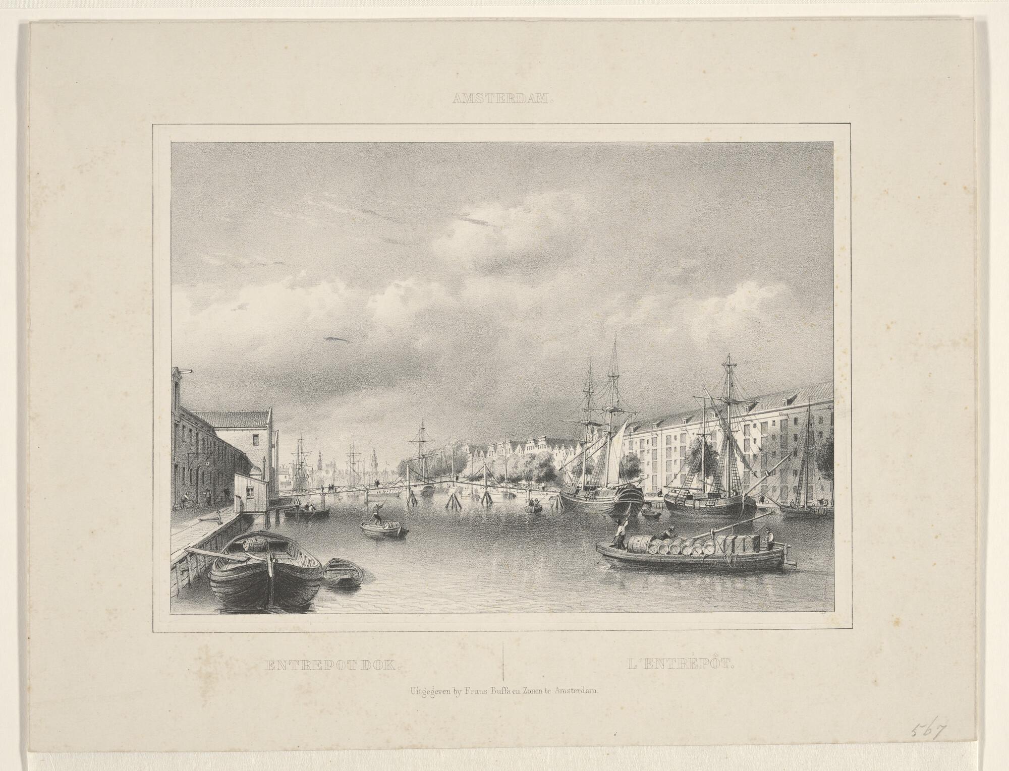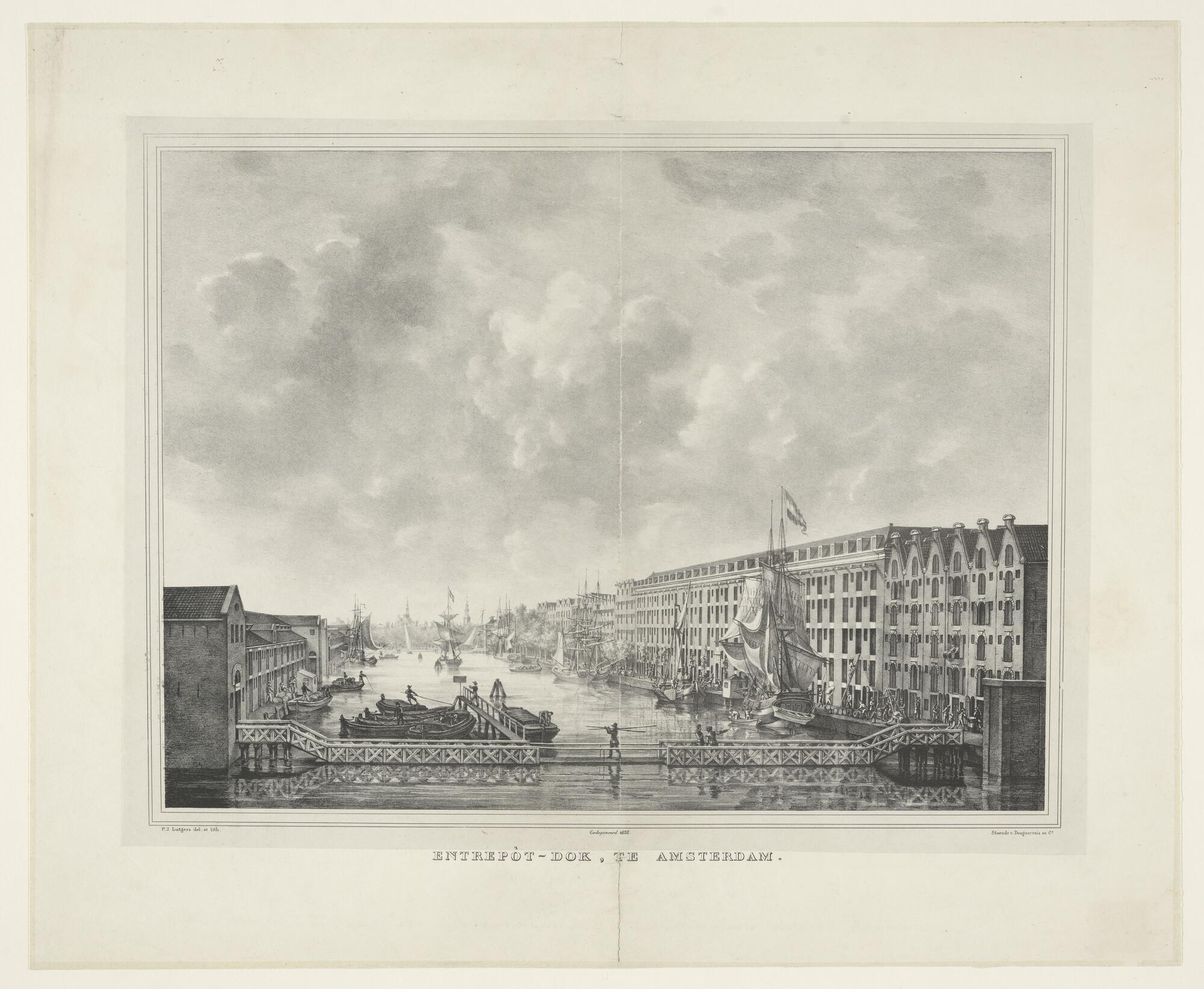 Lithografie van de haven van het Nieuwe Diep, met dr...