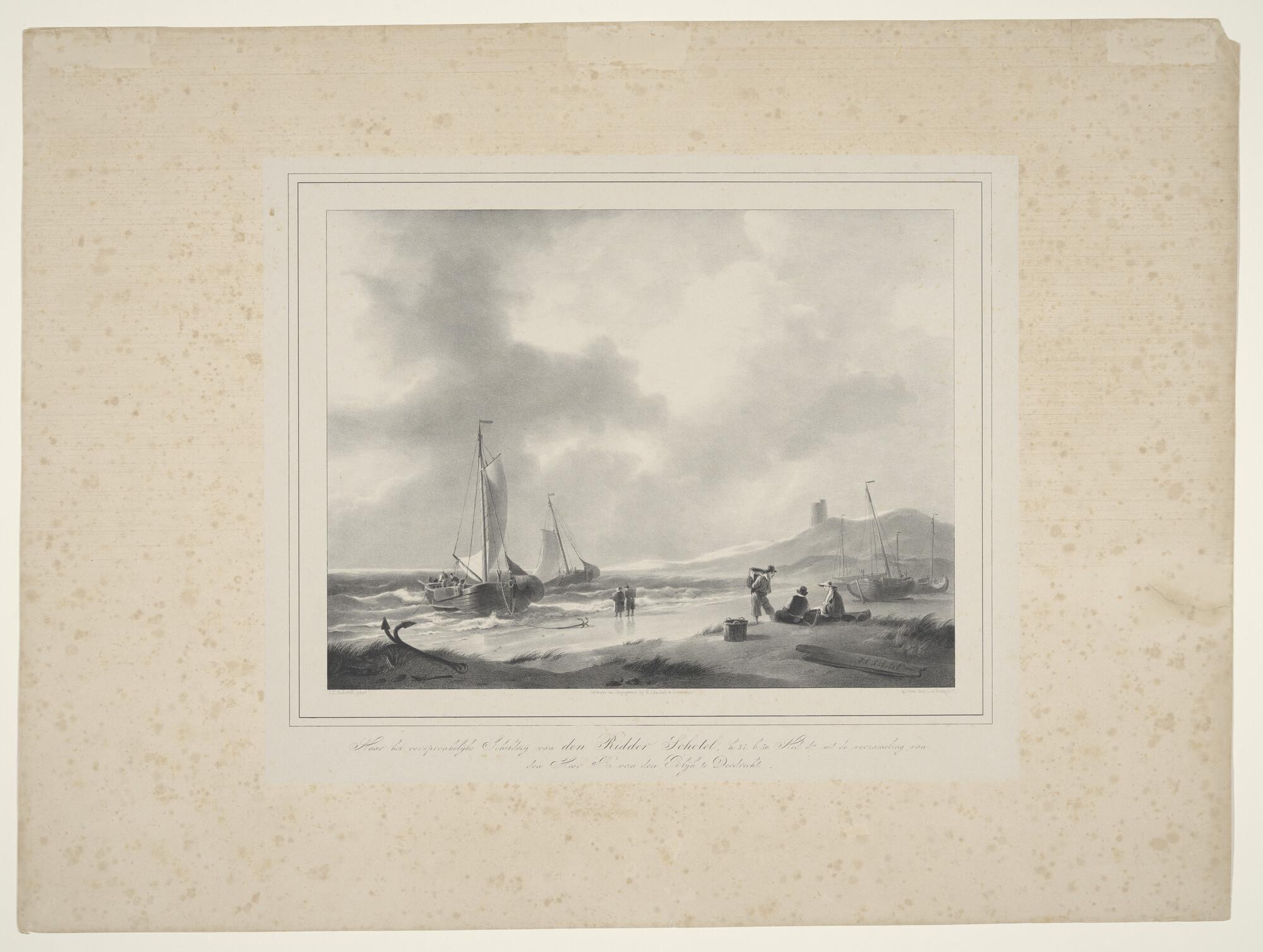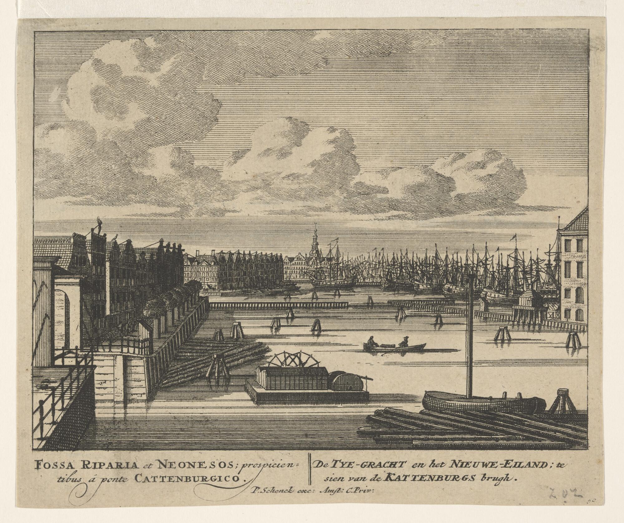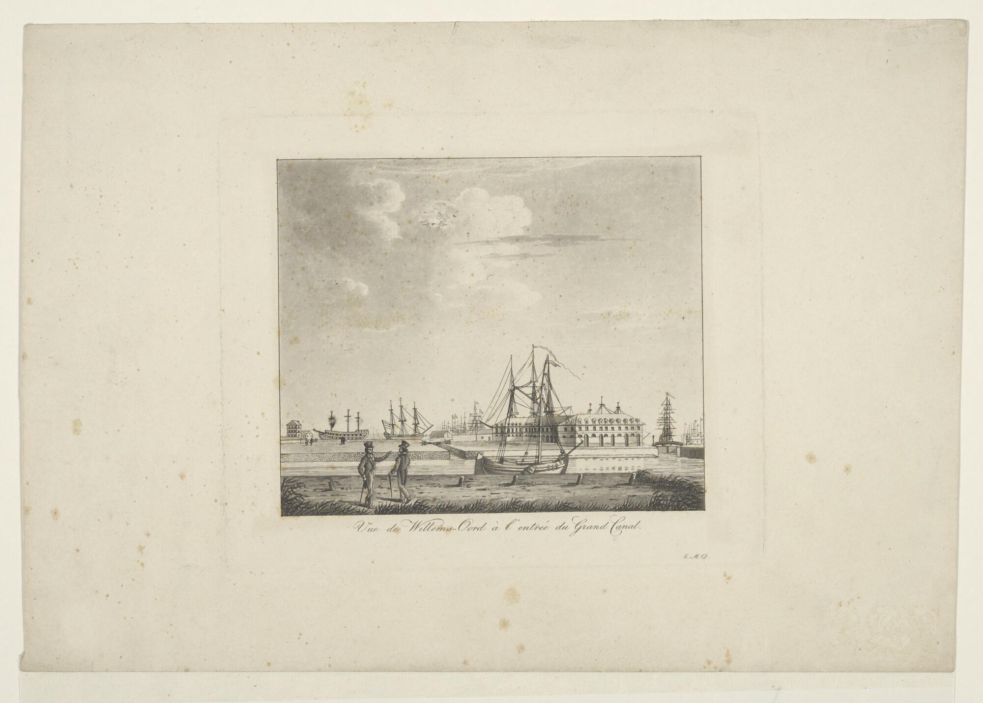 Lithografie van de haven van het Nieuwe Diep, met dr...