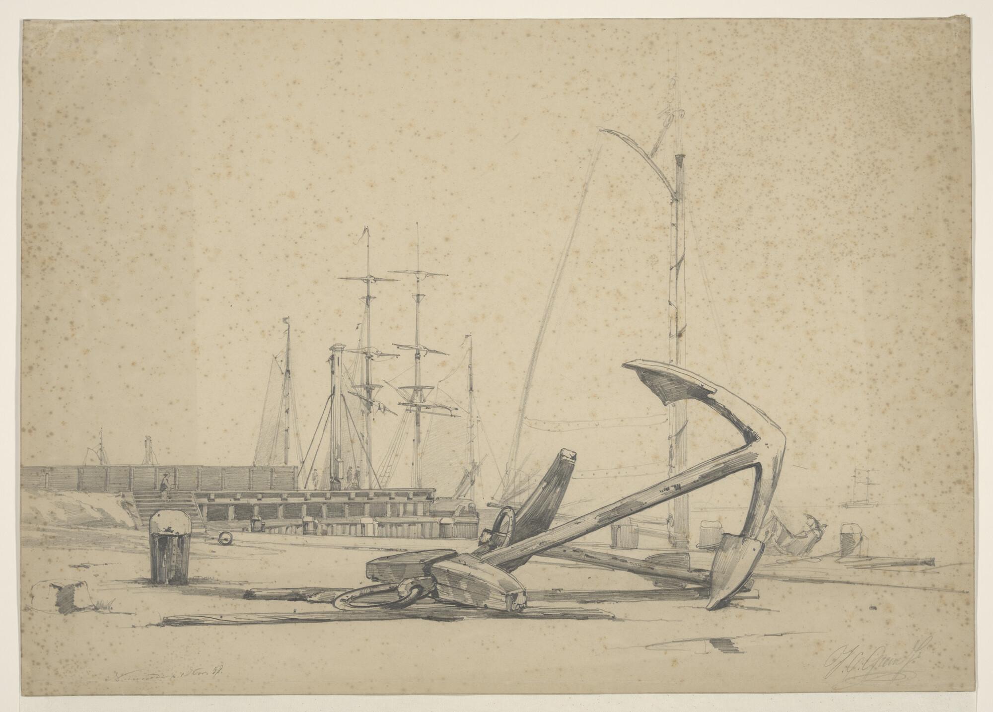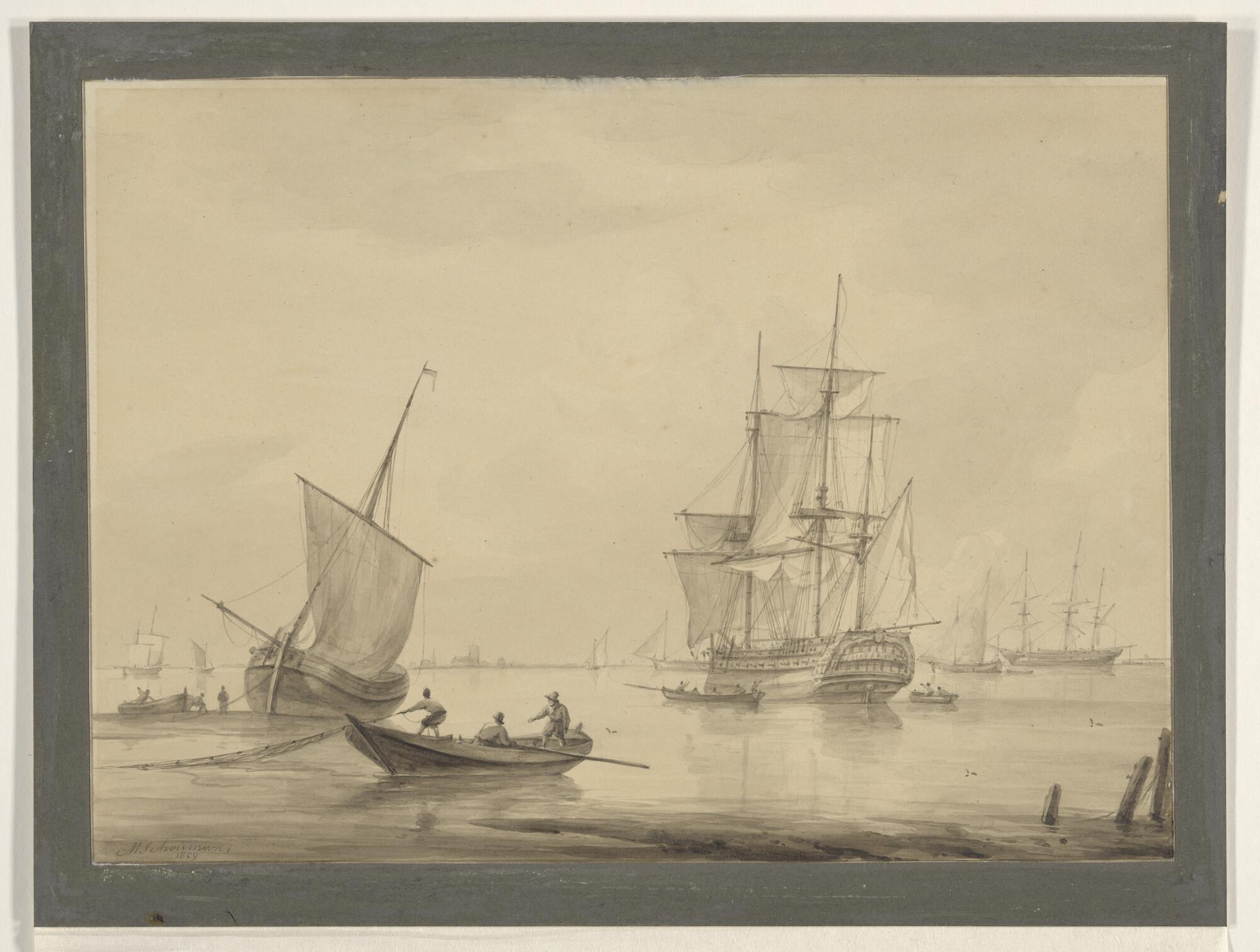 Een aantal schepen voor anker met onder andere recht...