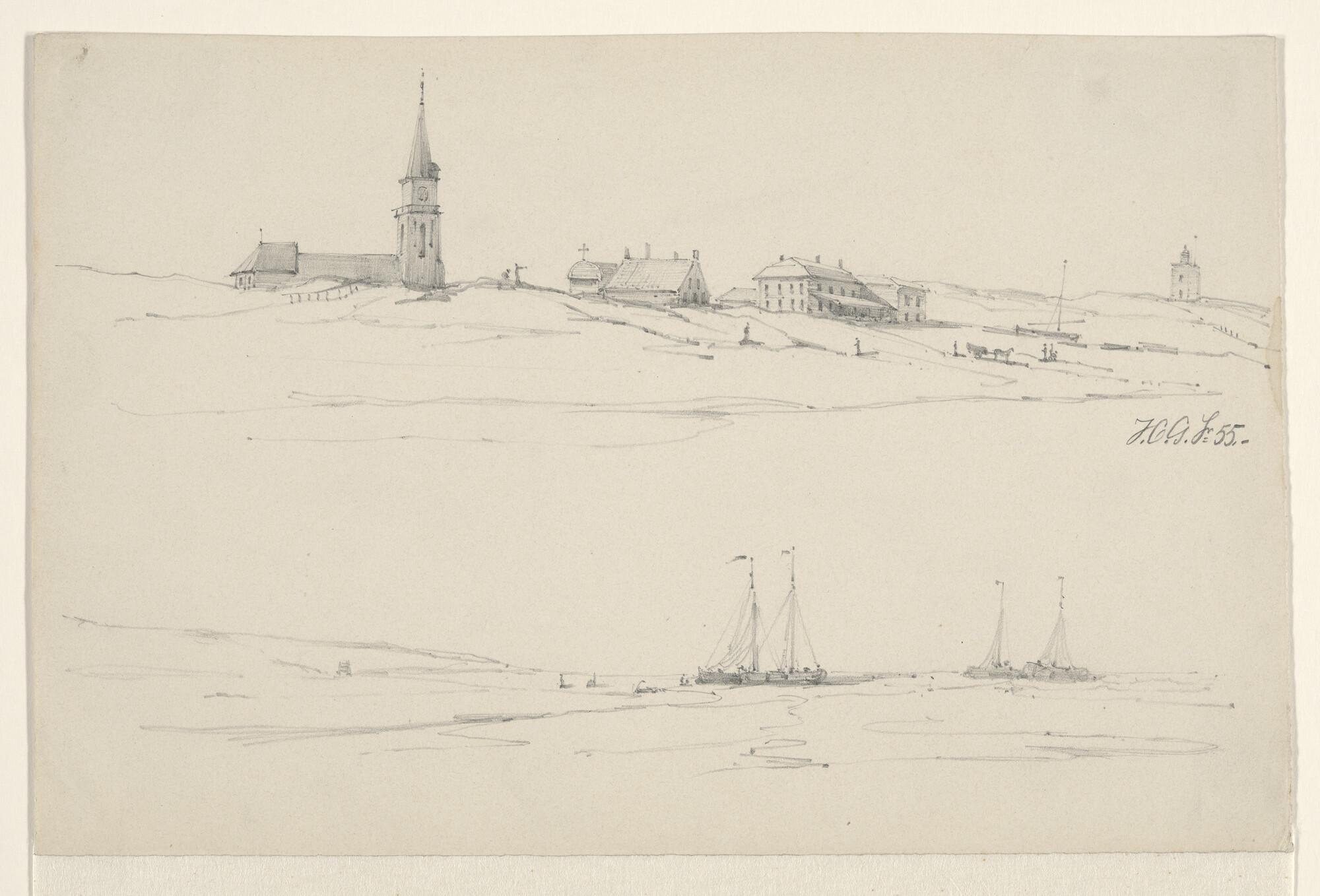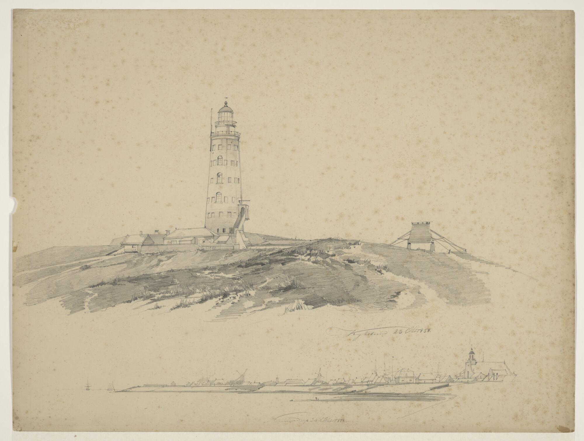 Blad met 2 tekeningen: de vuurtoren van Kijkduin bij...