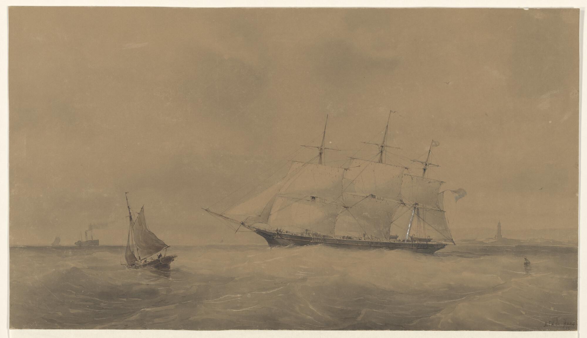 Een schoener en een raderstoomschip voor het eiland ...