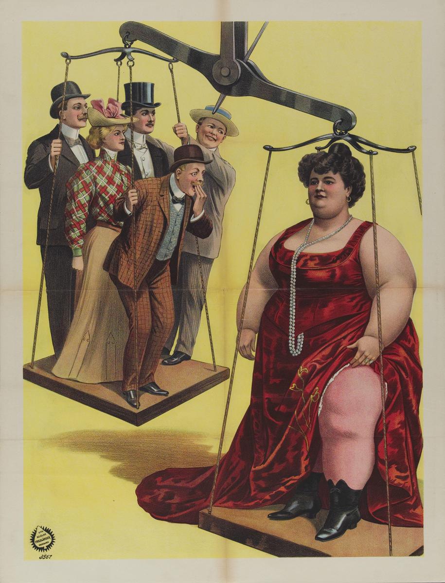 Vrouw op weegschaal; zij weegt meer dan 5 mensen