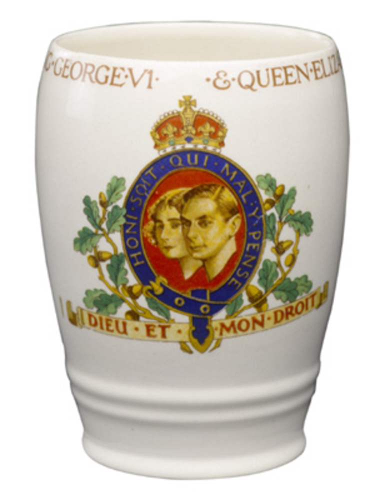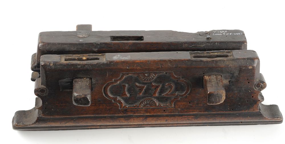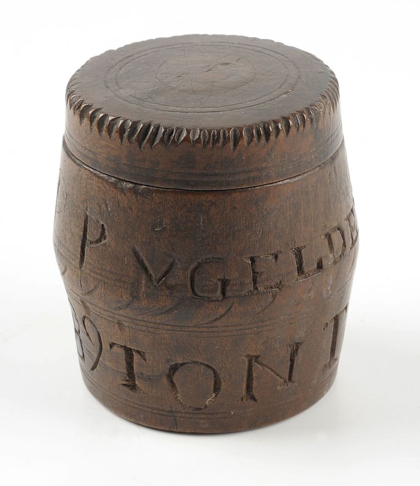 2 ijzeren messtins met scharnierende handgreep, 1940...