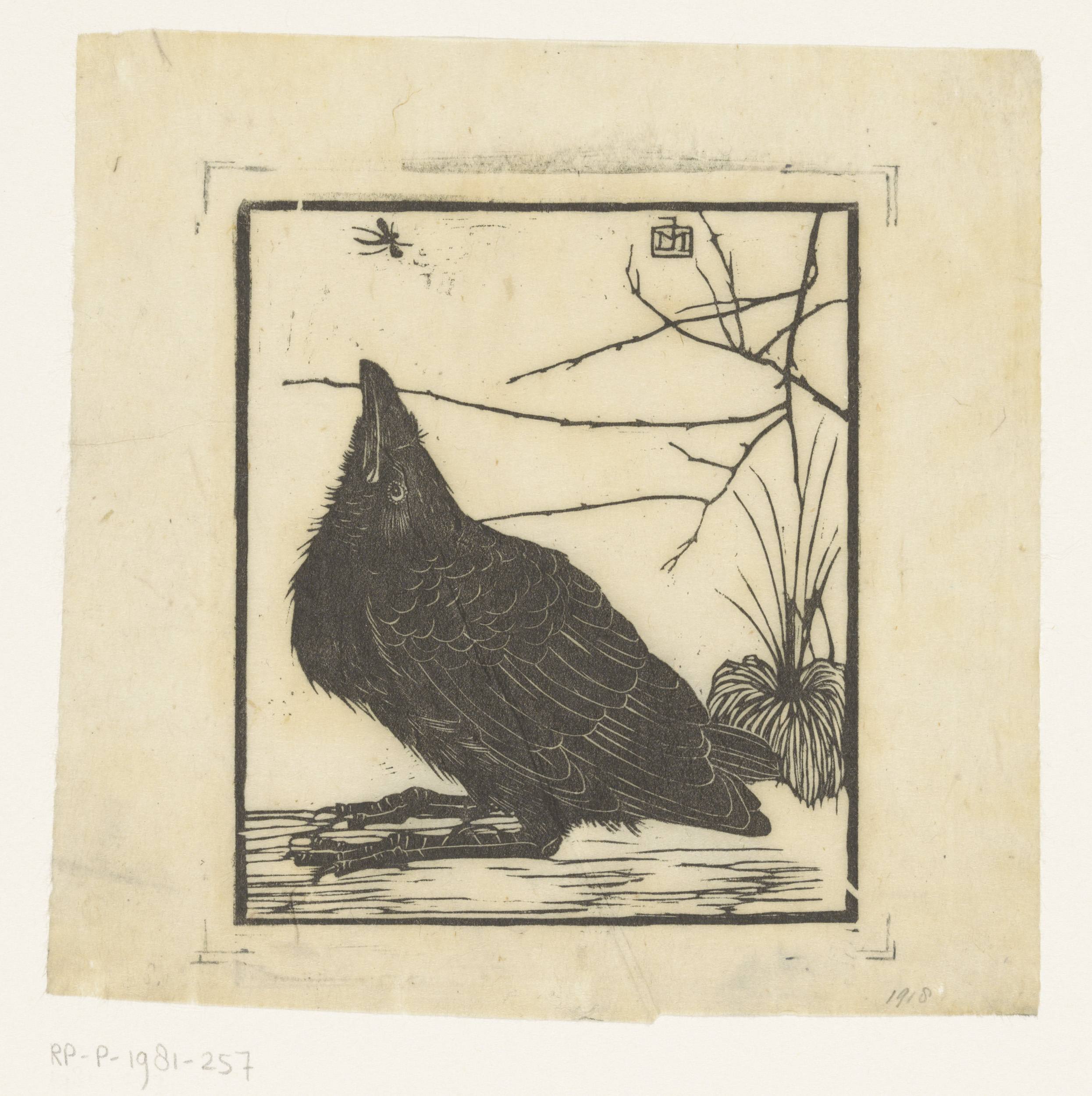 Kraai, omhoogkijkend naar mugje