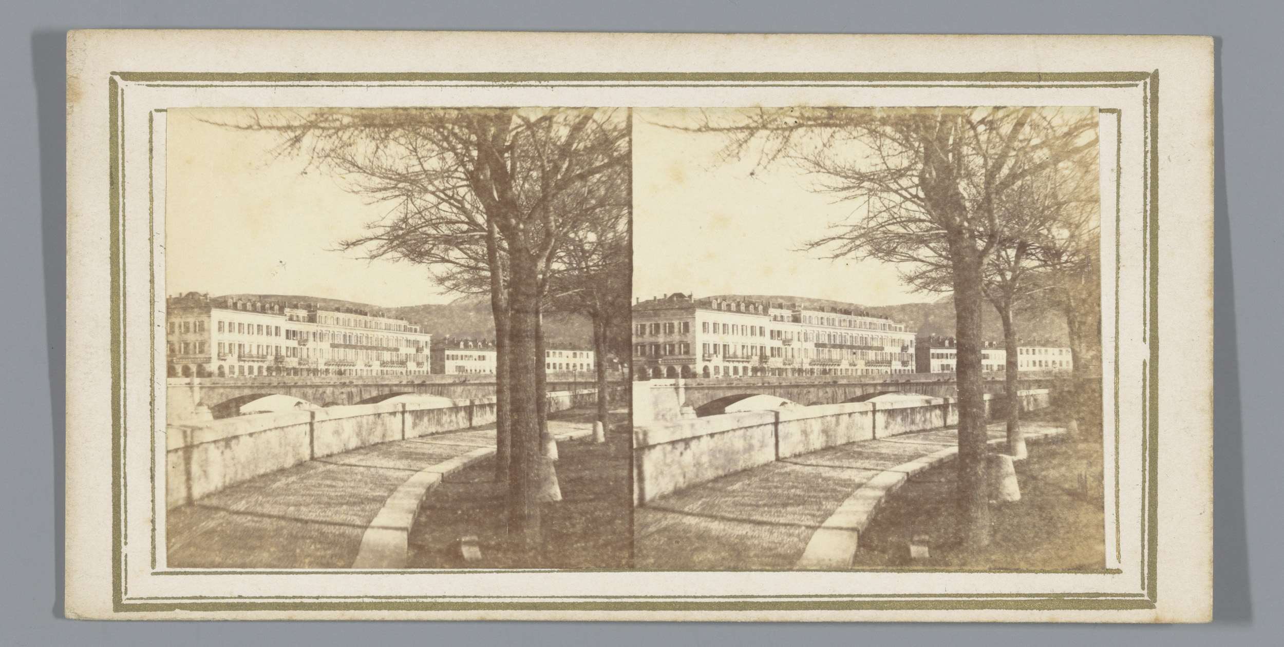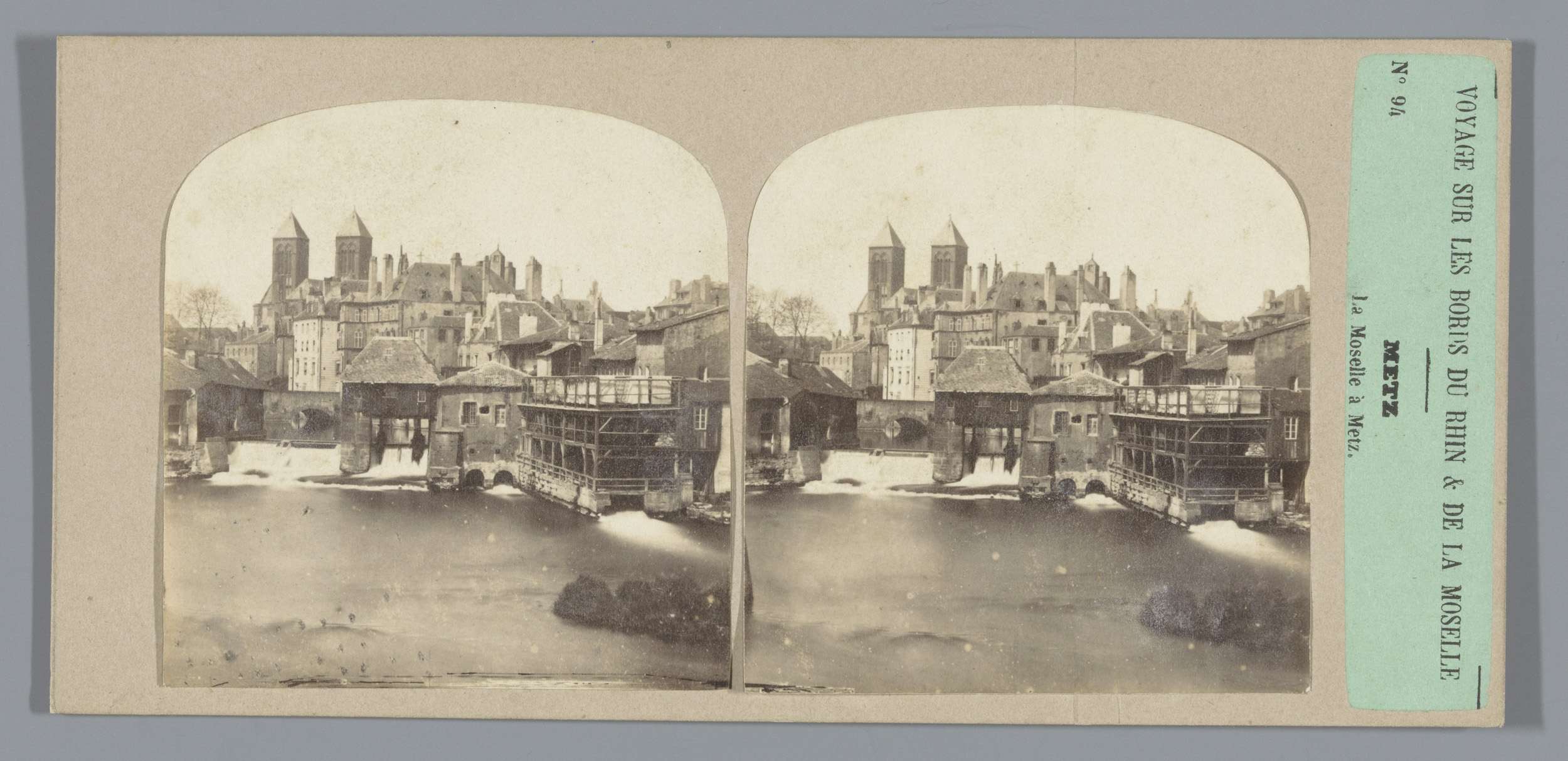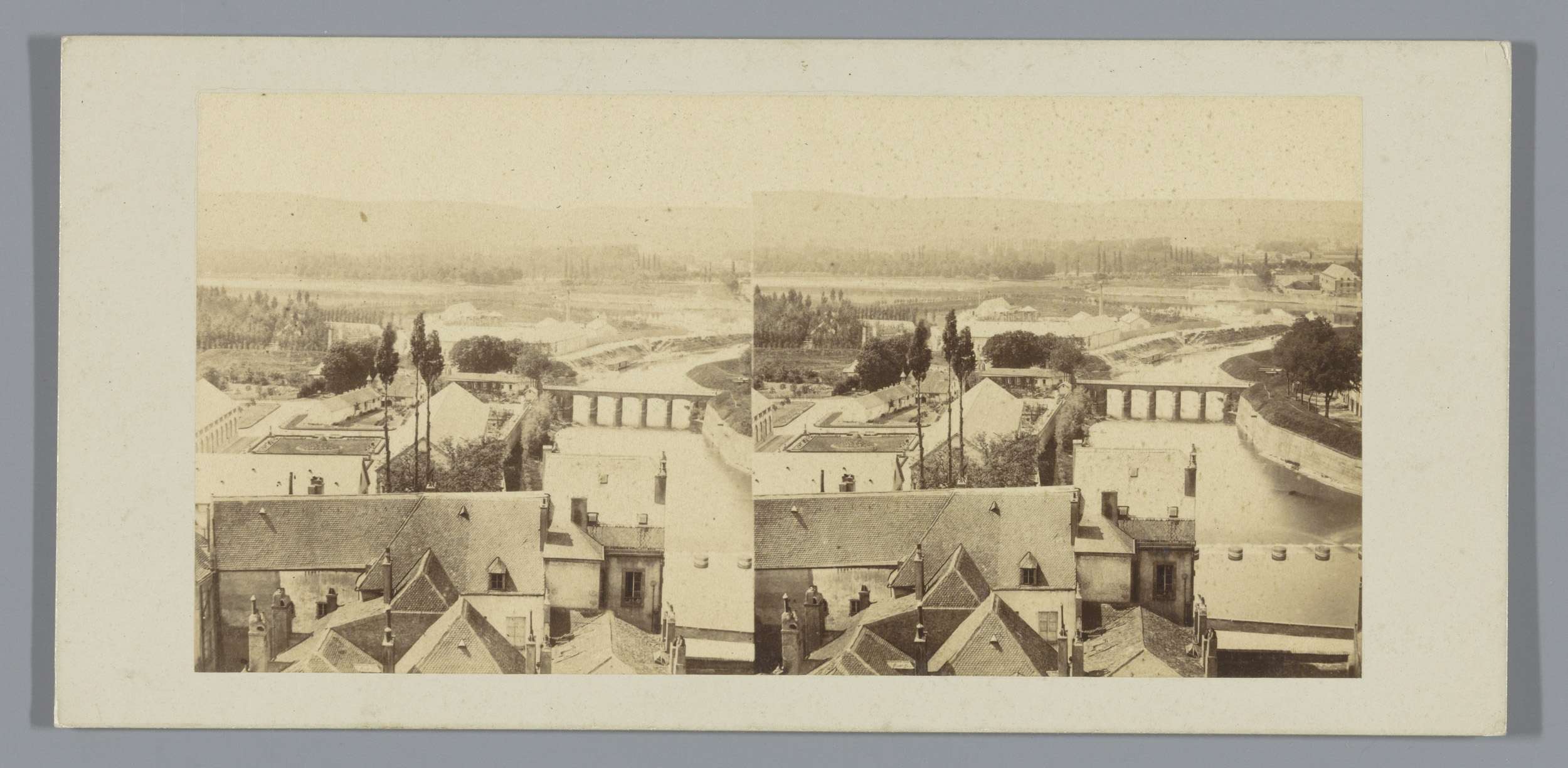 Gezicht op een stad aan een rivier, vermoedelijk Metz