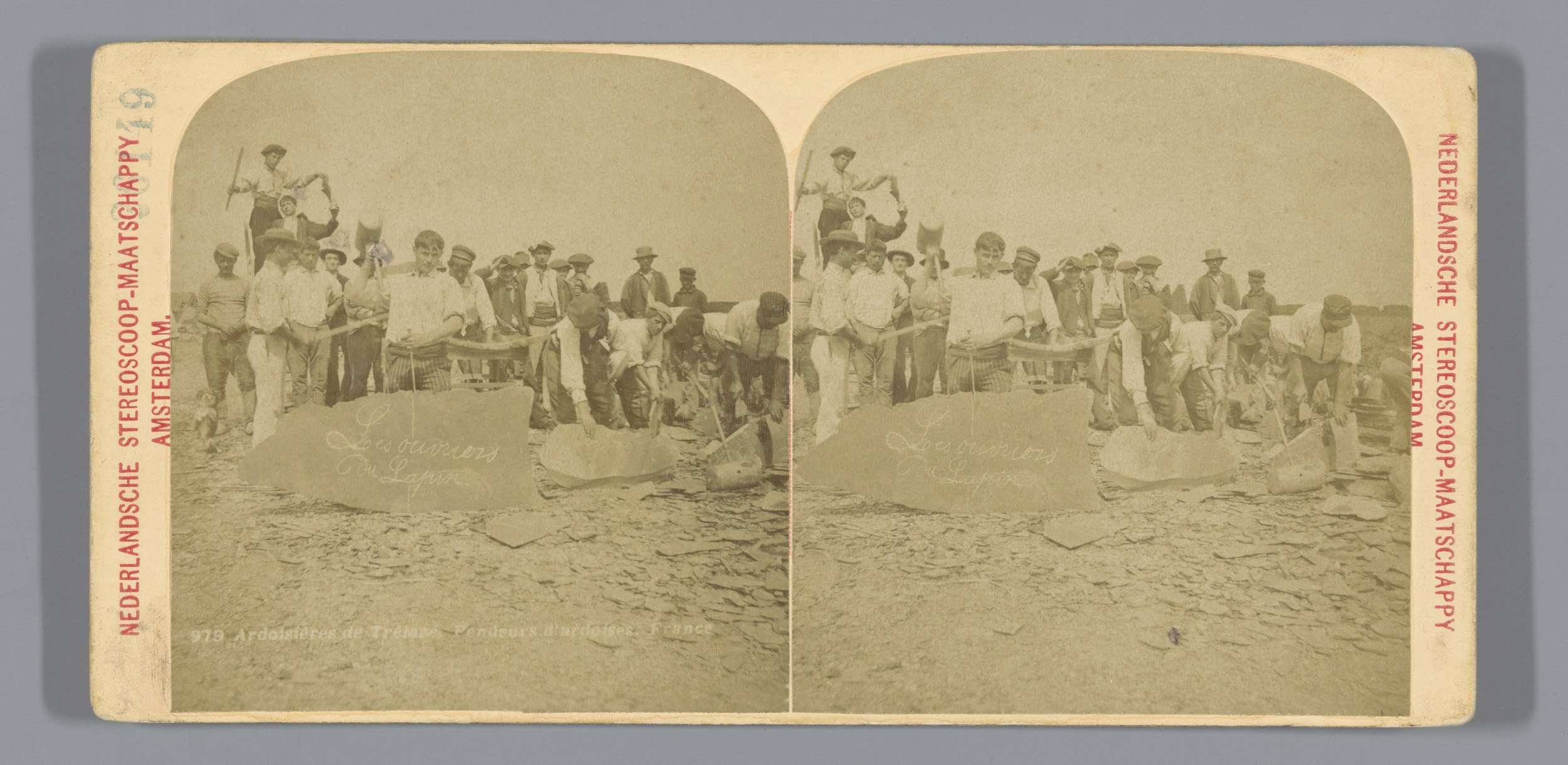 Steenhouwers die met leisteen werken in Trélazé