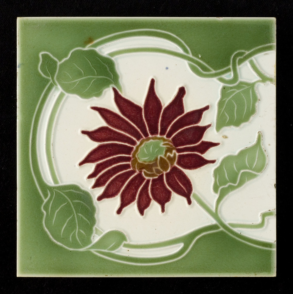 Tegel in reliëf, met voorstelling: gestileerde bloem...