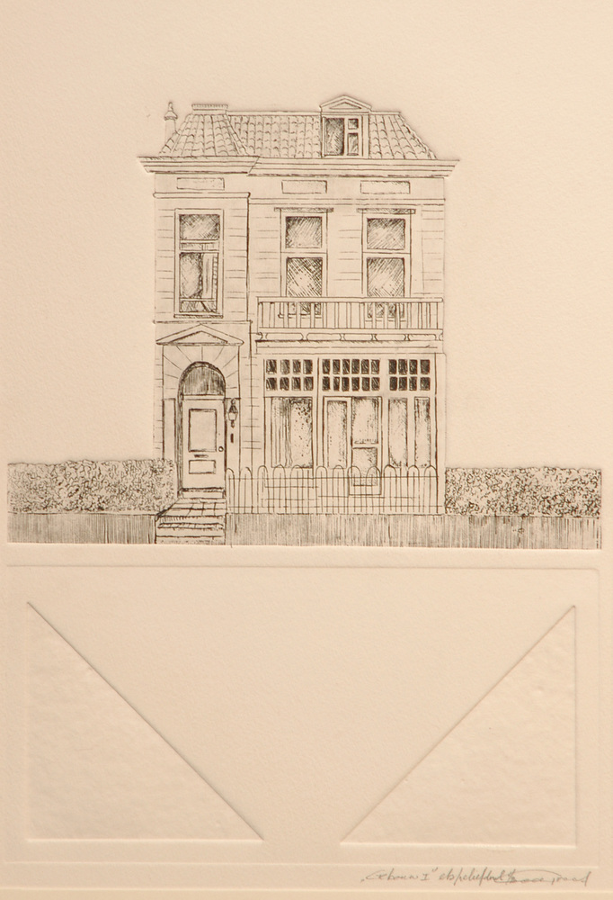 Ets, reliefdruk, voorstellende een woonhuis aan de T...
