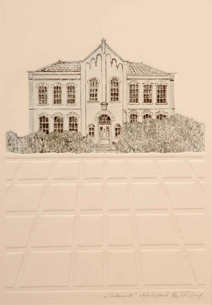 Ets, reliefdruk, voorstellende de Wilhelminaschool a...