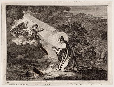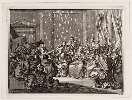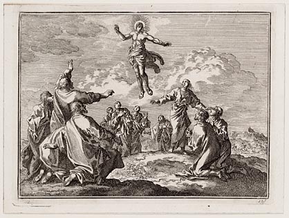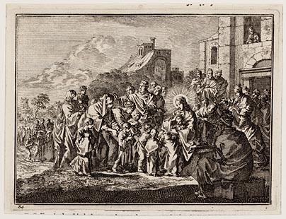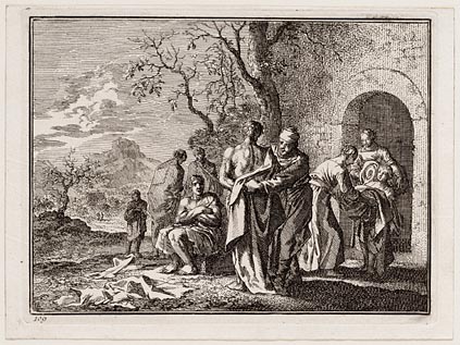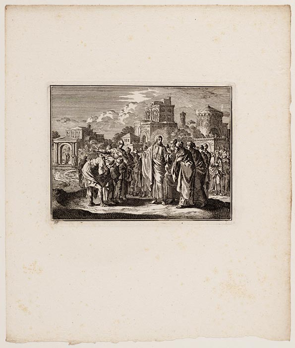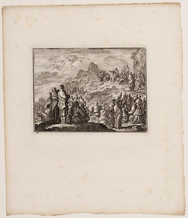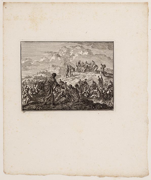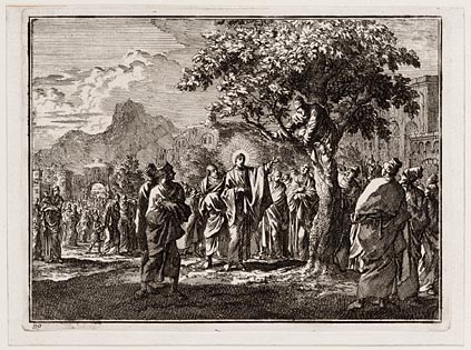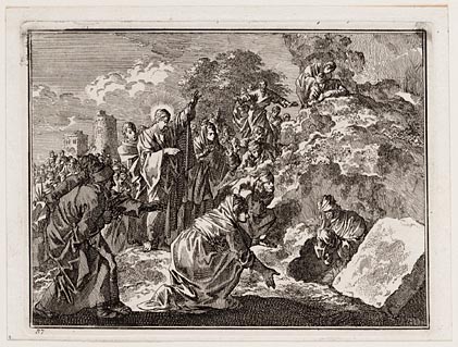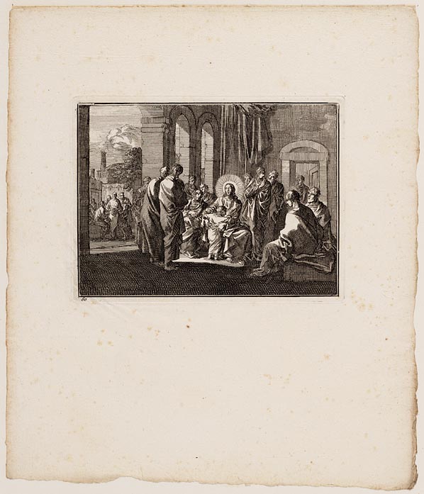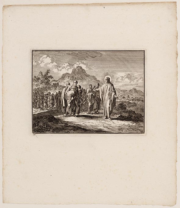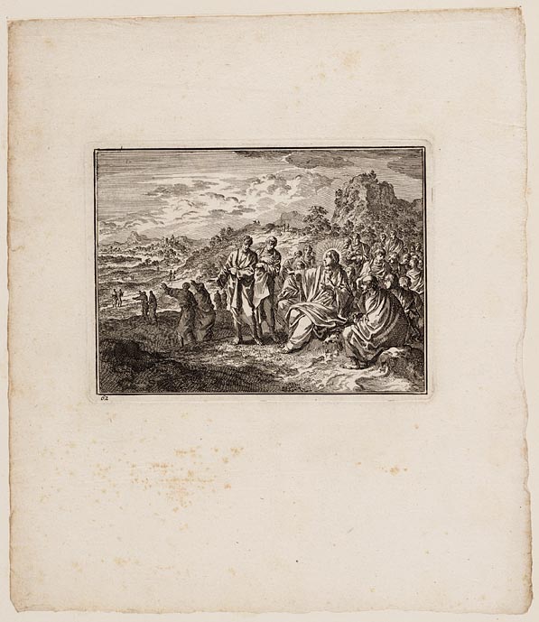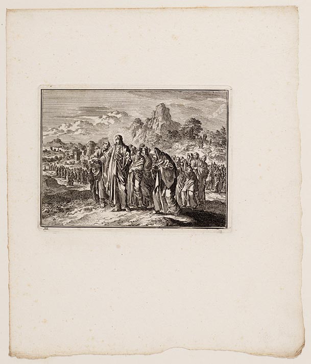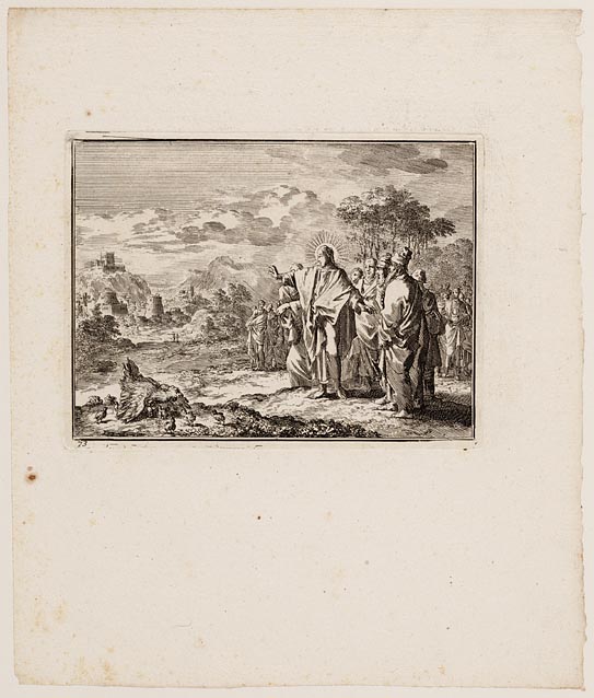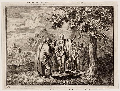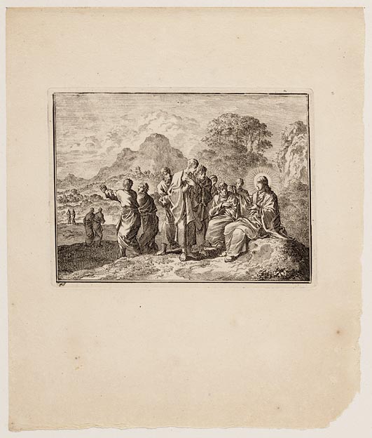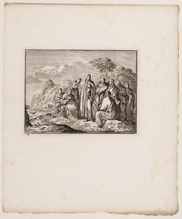 Jezus omringd door zijn discipelen stelt hun een kin...
