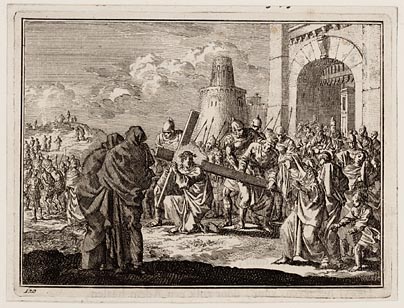 Buiten de poort valt Jezus neer onder het gewicht va...