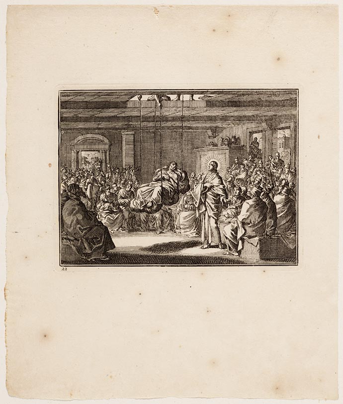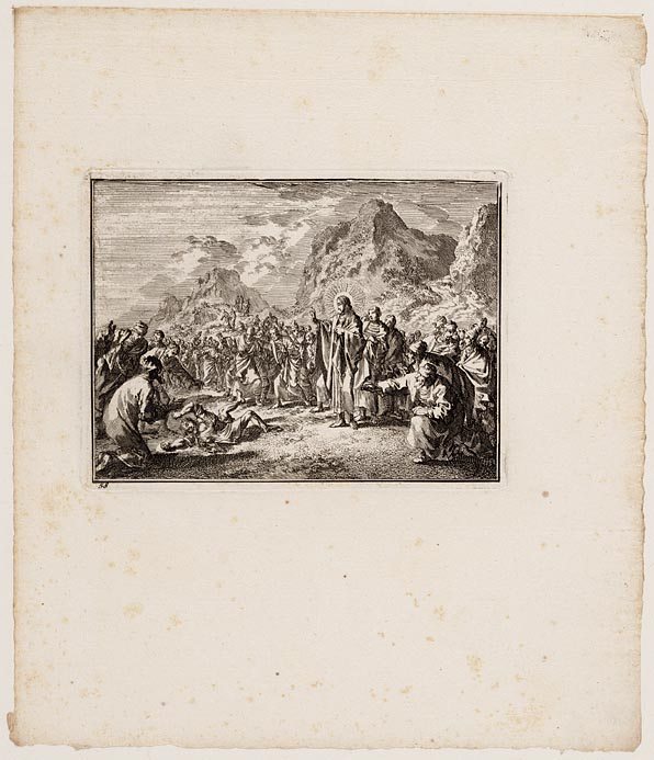 Jezus geneest een bezeten kind dat zich voor hem op ...