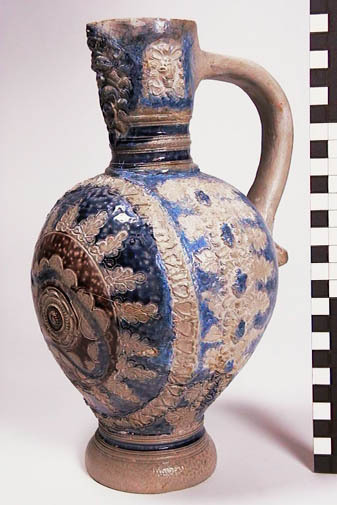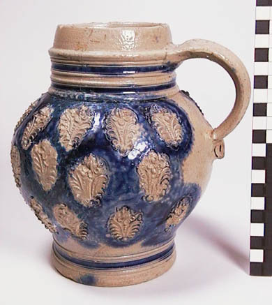 Steengoed kan met appliques, zoutglazuur, kobalt en ...