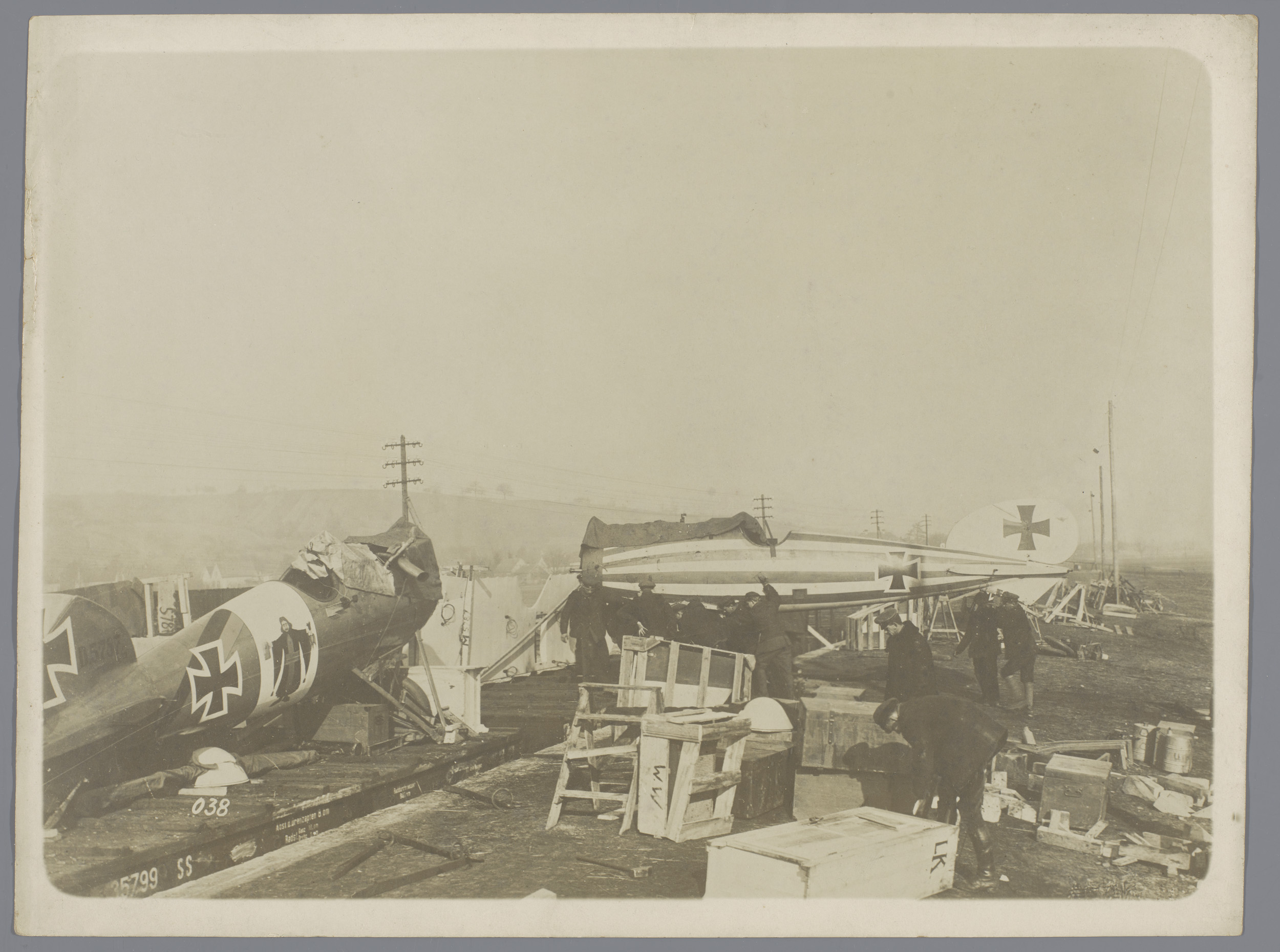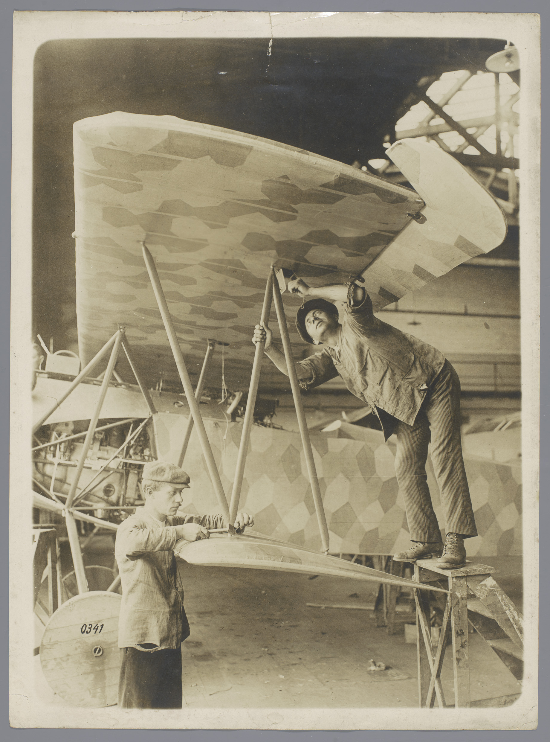 Monteurs en jachtvliegtuig Fokker D VII met camoufla...