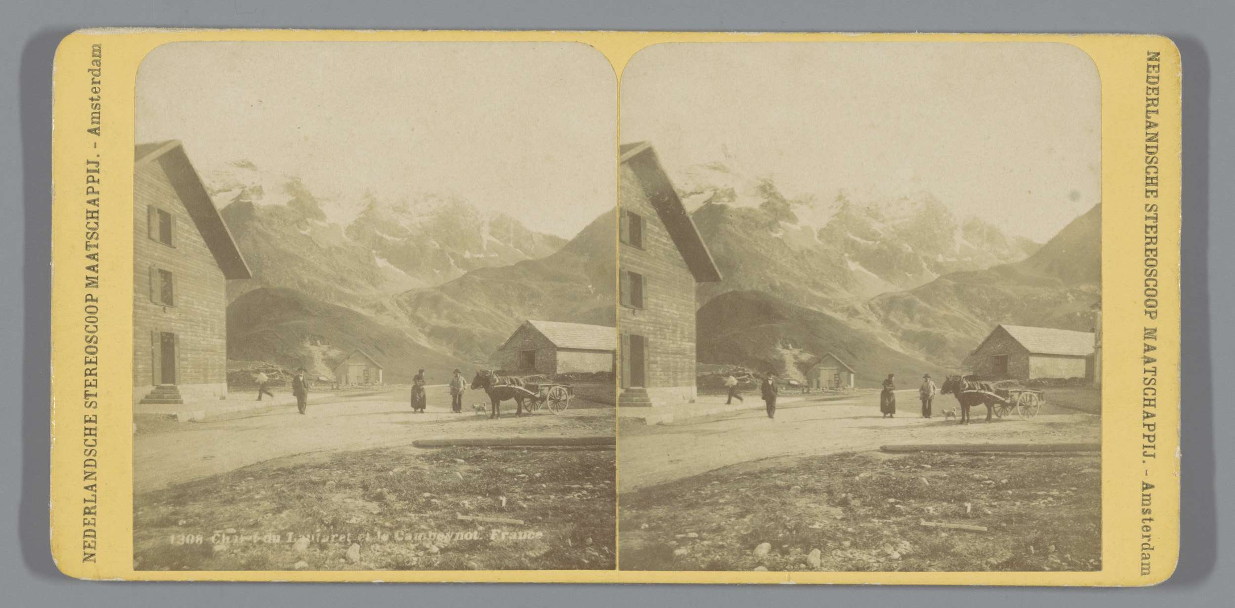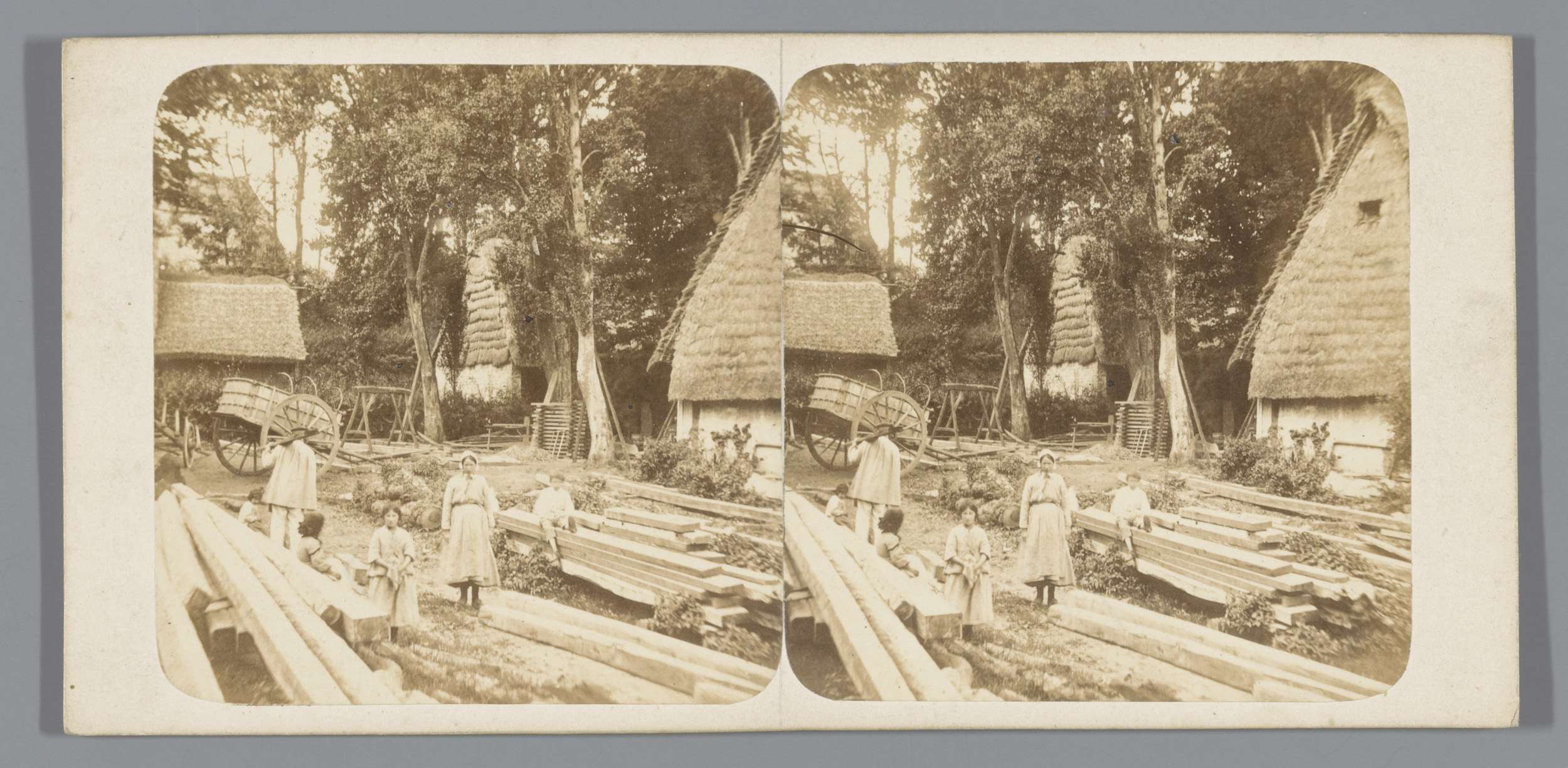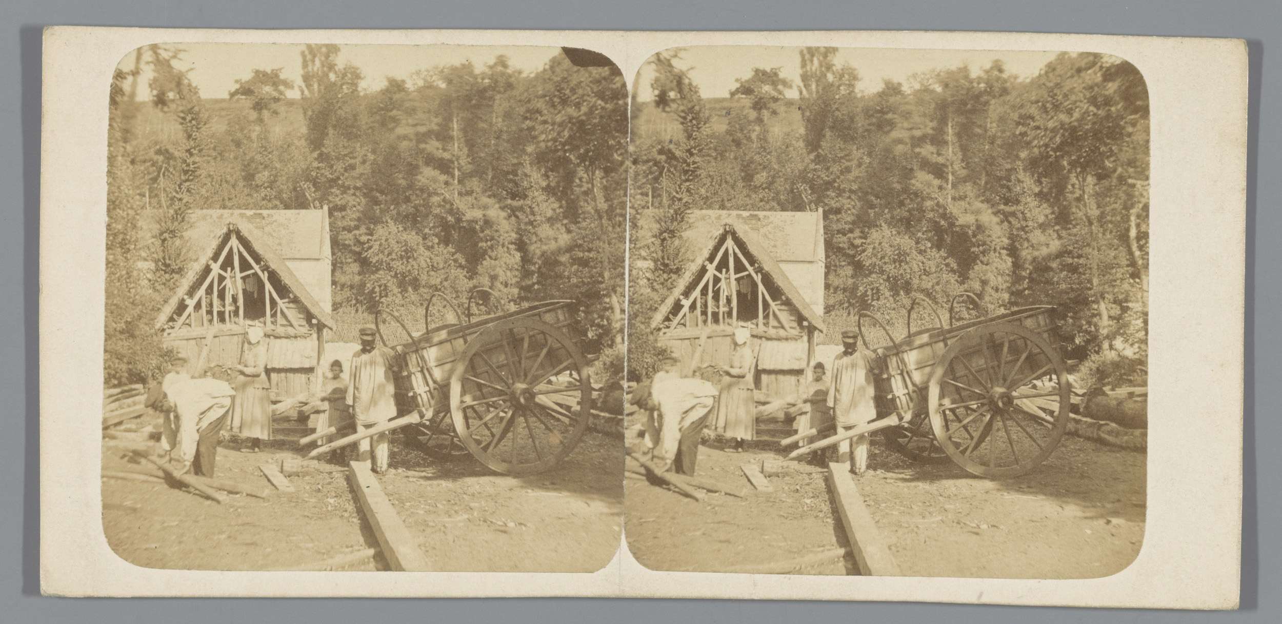 Personen naast een houten kar te Normandië