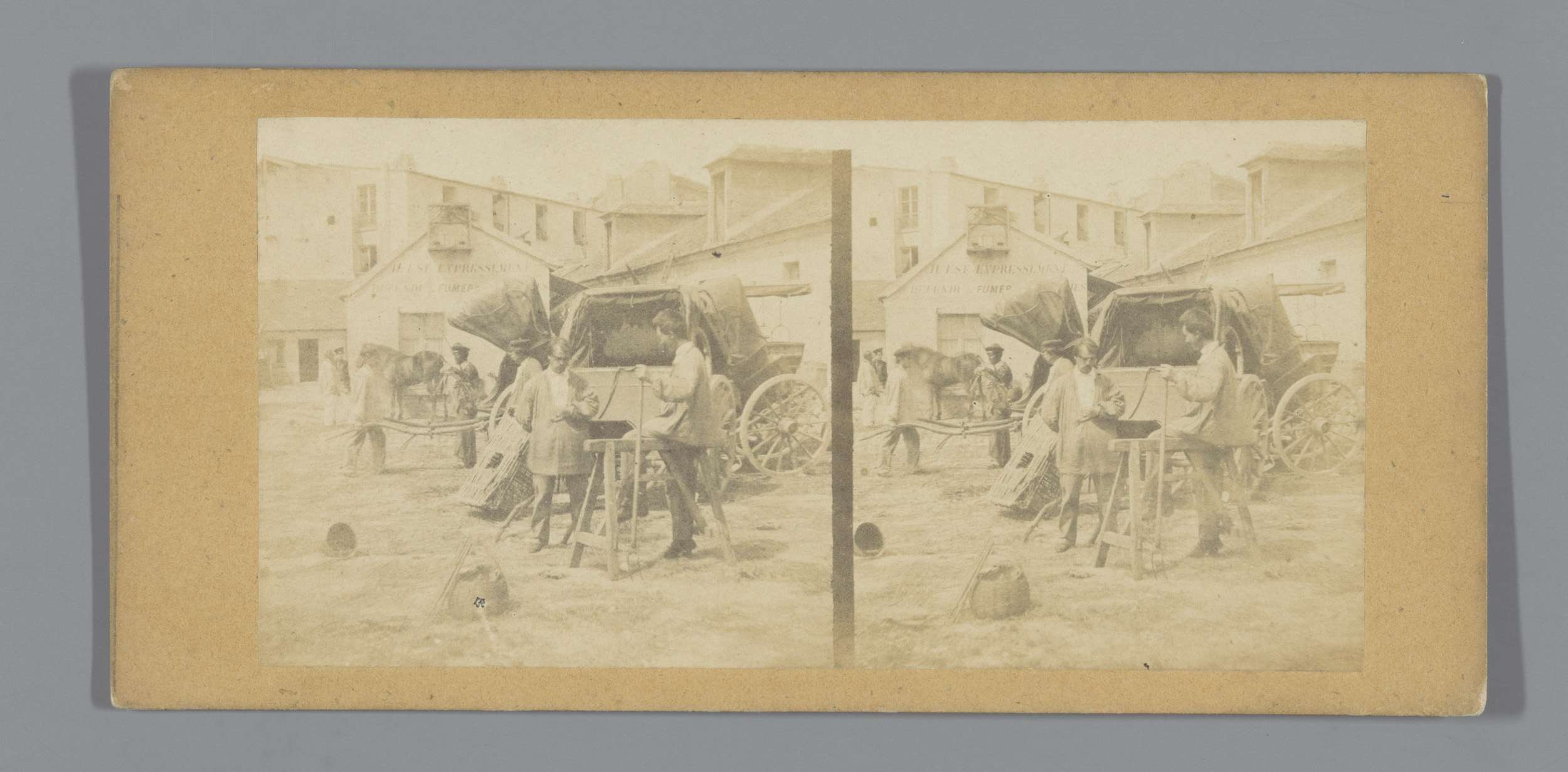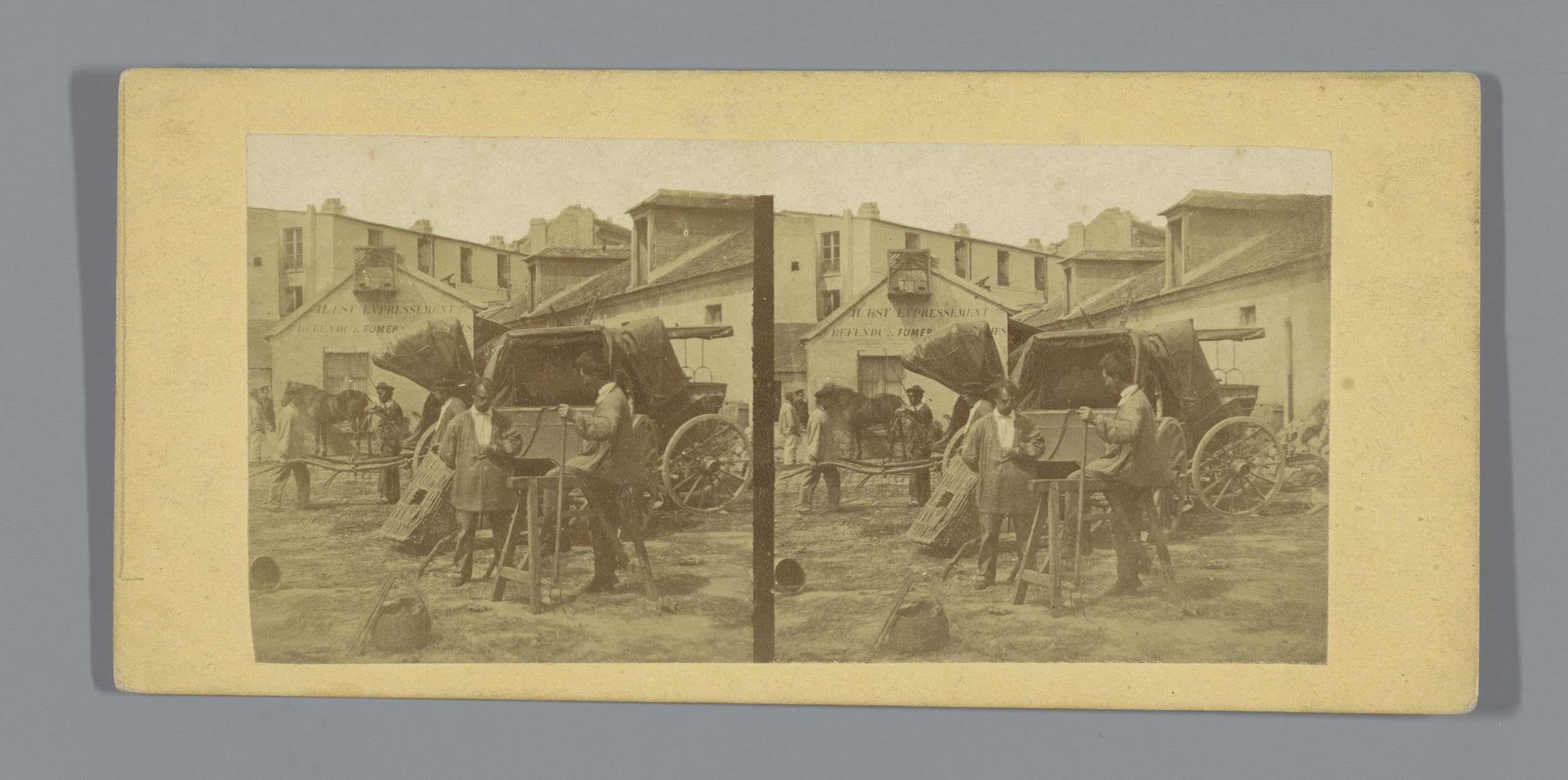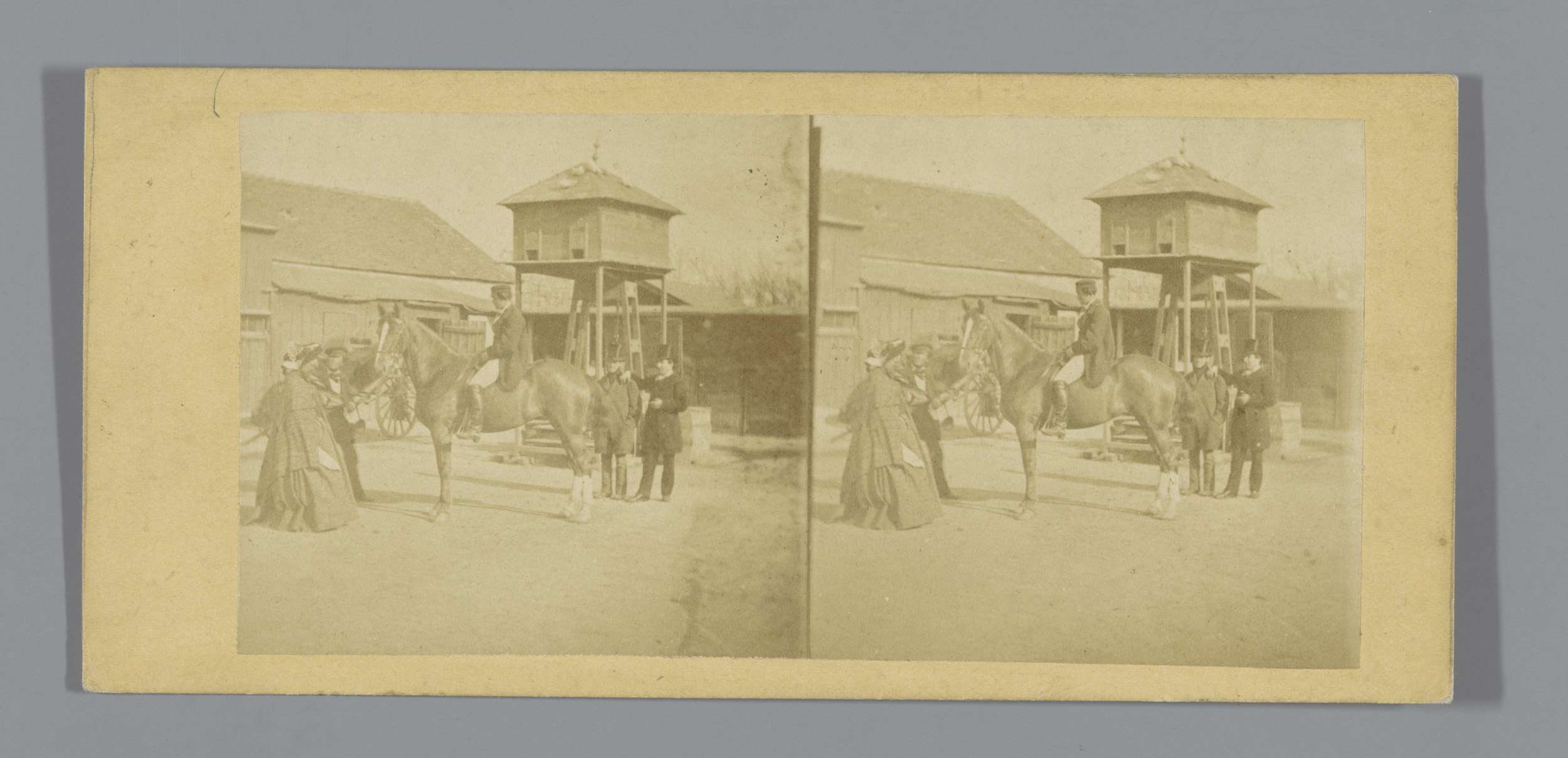 Mannen op een plein voor een rijtuig (vermoedelijk) ...