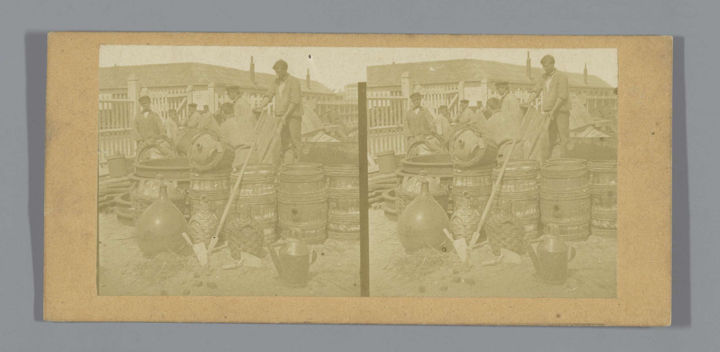 Mannen tussen vaten en mandflessen (vermoedelijk) te...