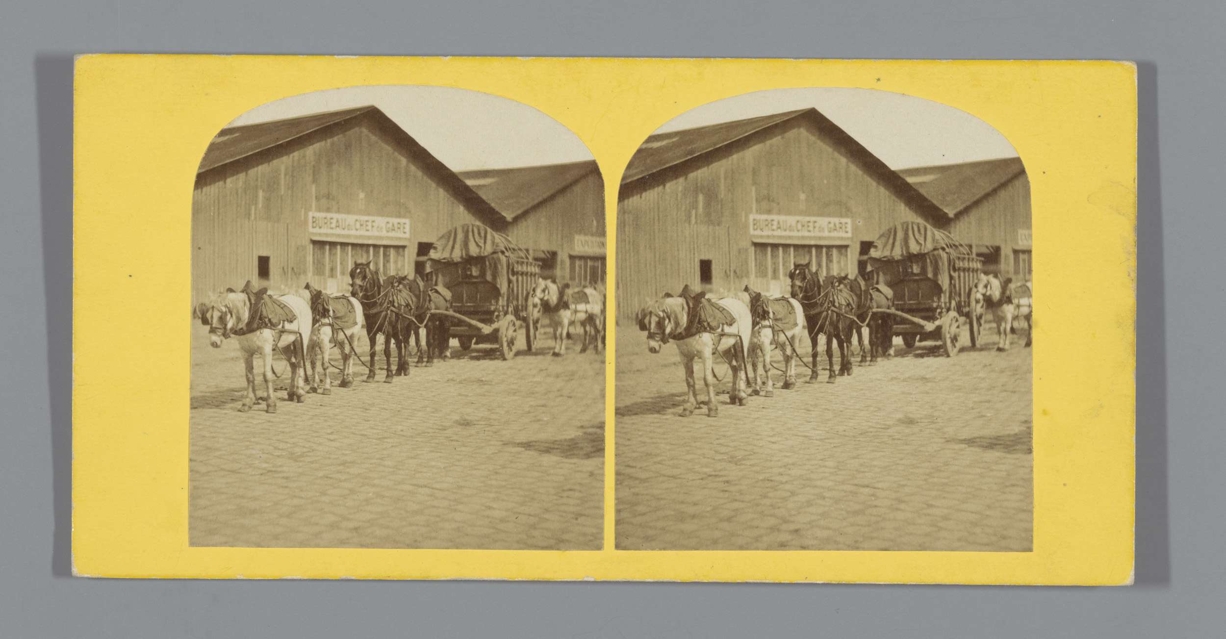 Paardenwagen voor een stationsgebouw (vermoedelijk) ...