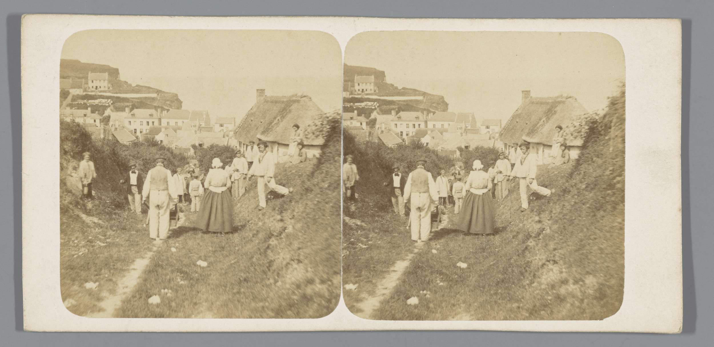 Groep mensen op een landweg in een dorp (vermoedelij...