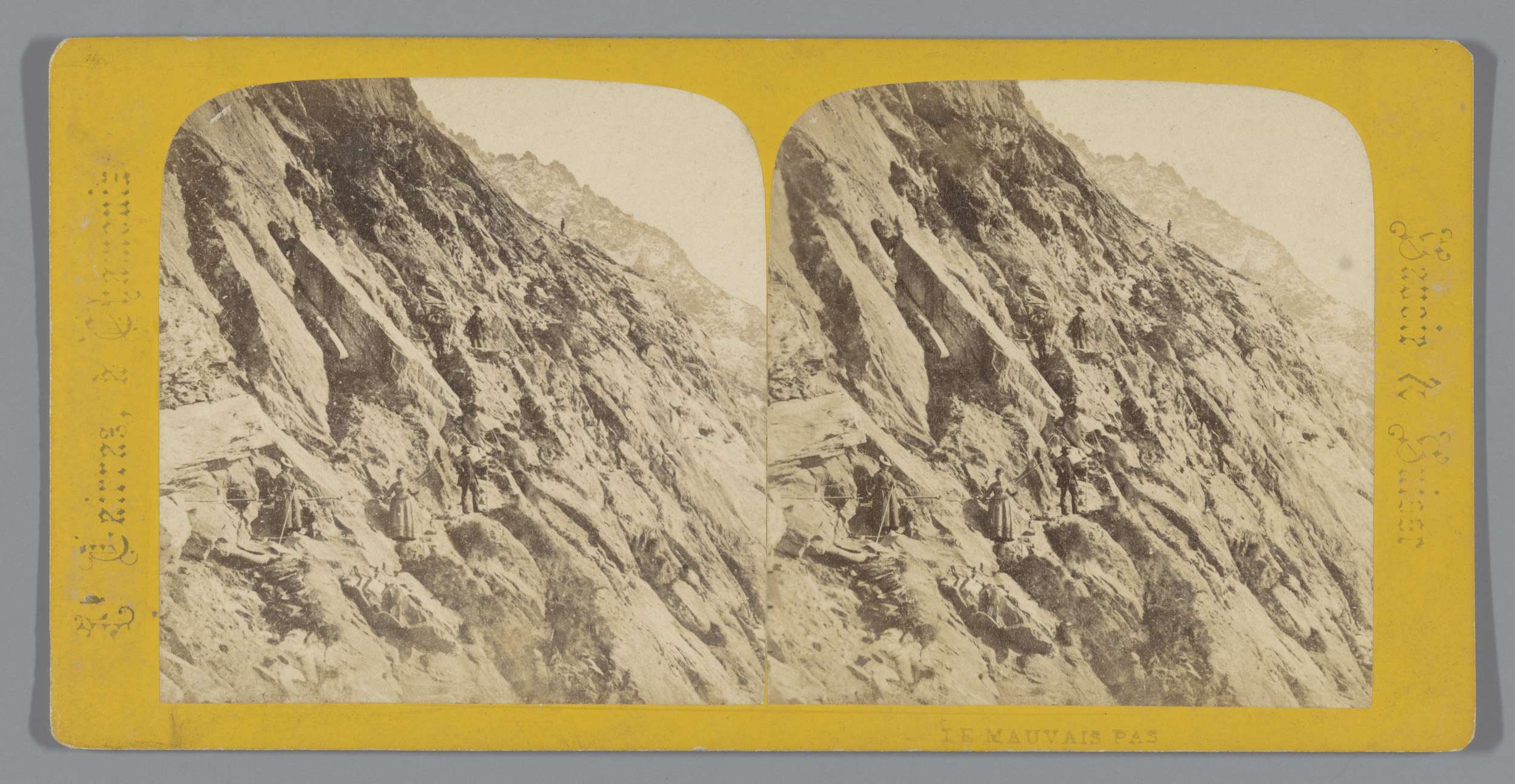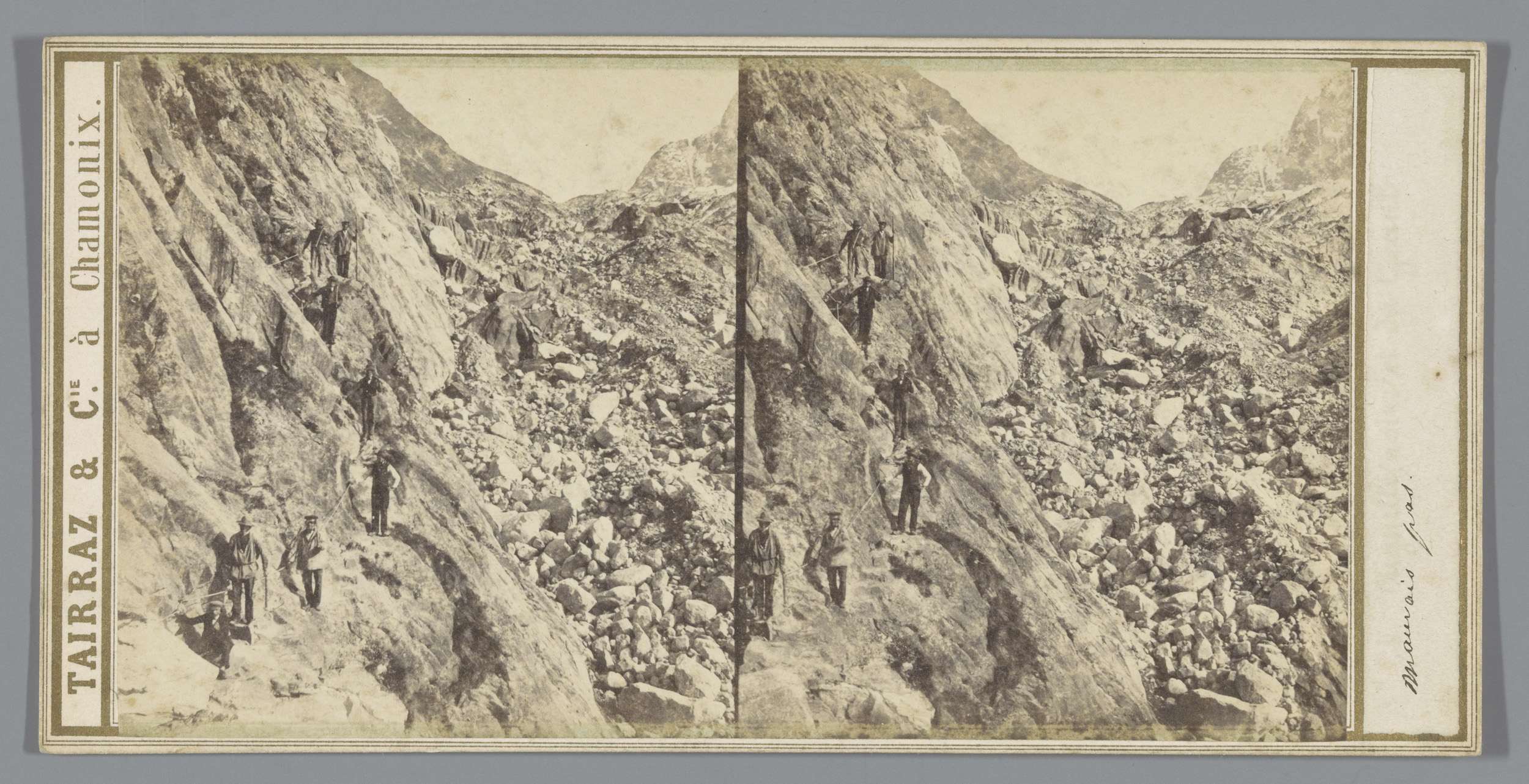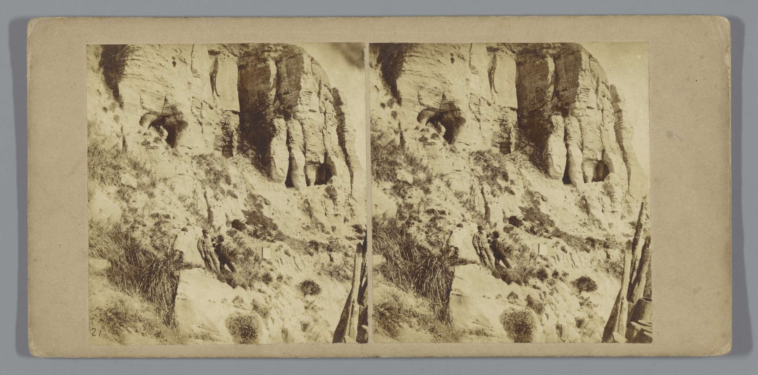 Drie personen in een rotslandschap (vermoedelijk) te...