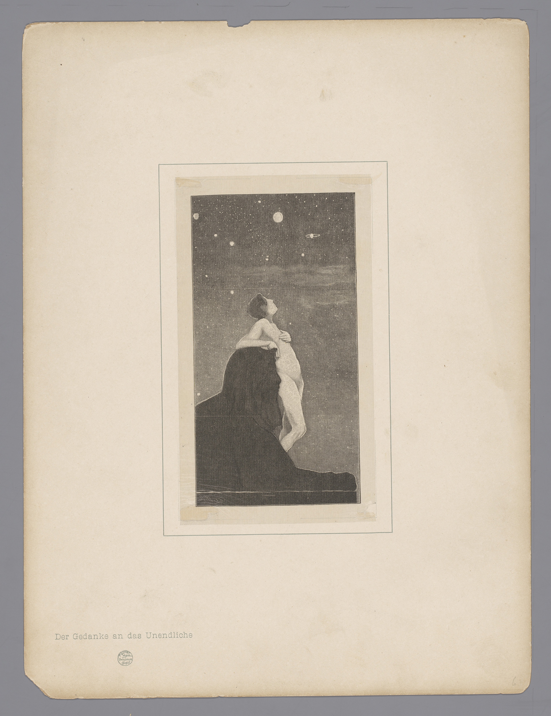 Naakte vrouw bij een sterrenhemel leunt op een rots ...