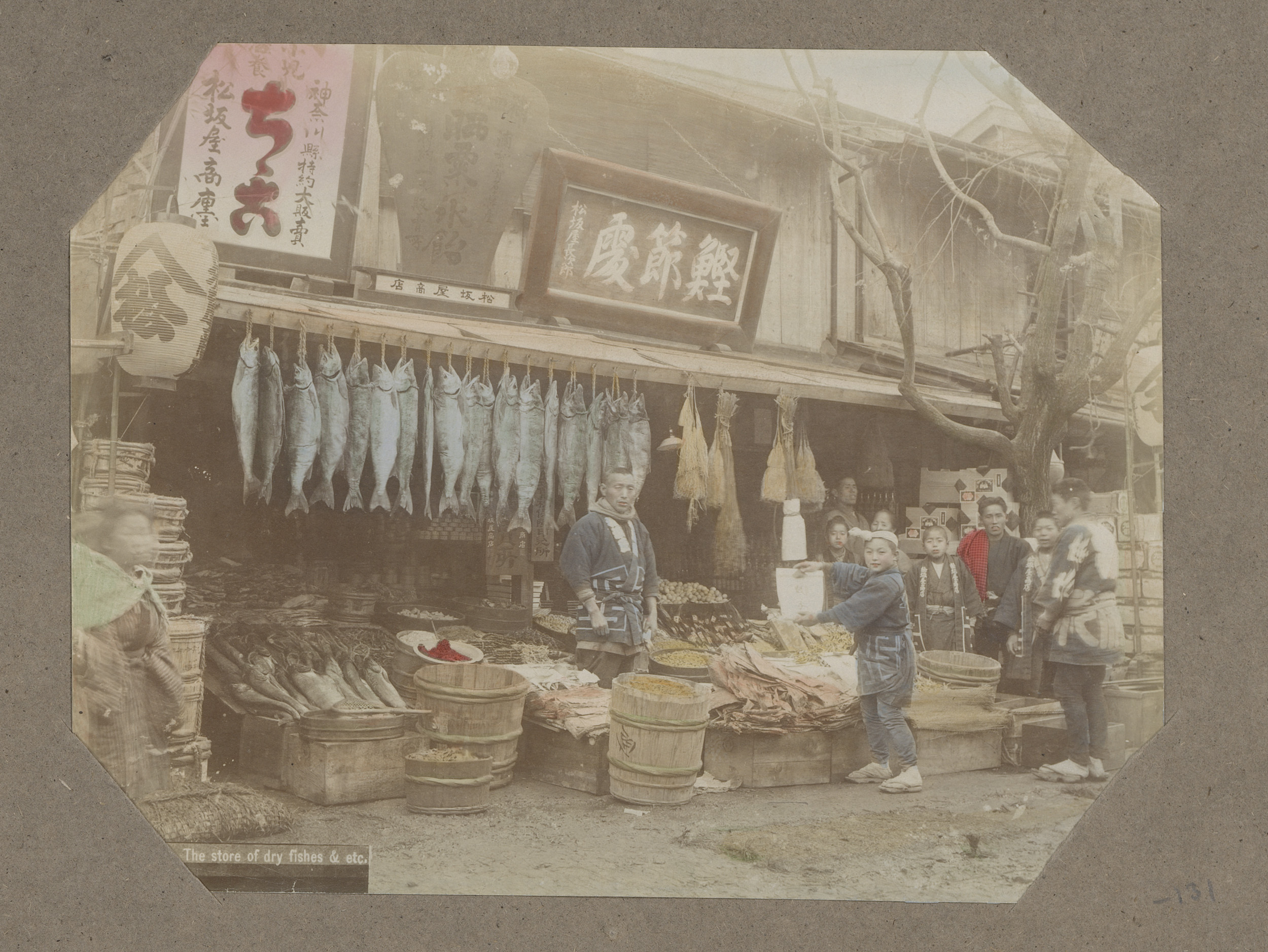 Gezicht op een marktkraam met gedroogde vissen, Japan