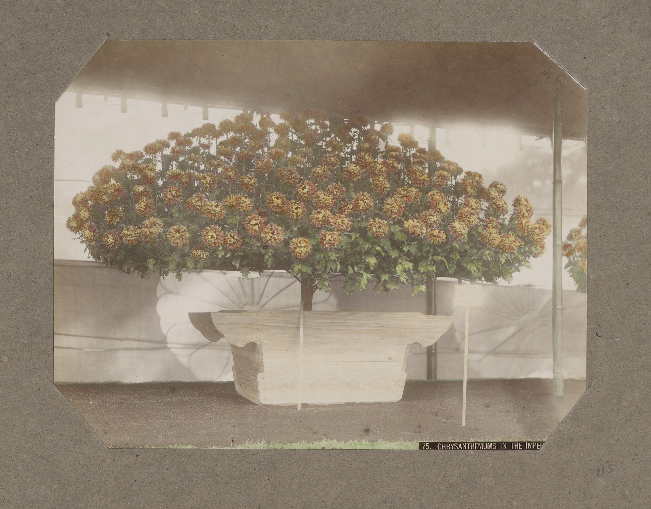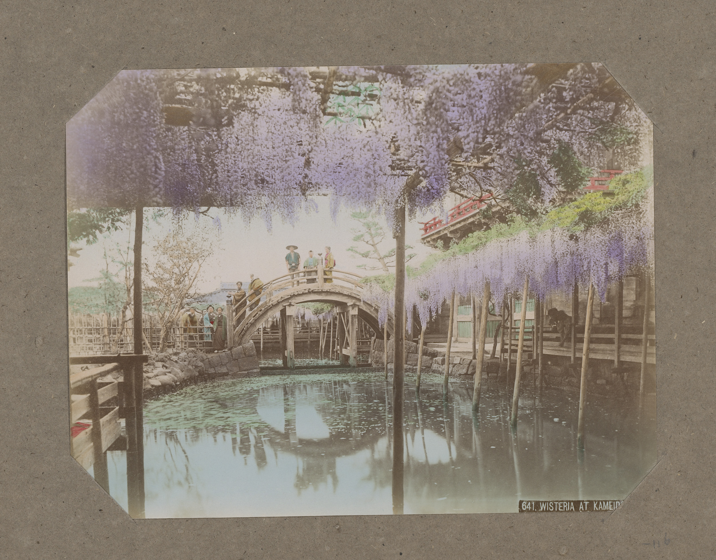 Mensen op een brug, met op de voorgrond bloeiende bl...