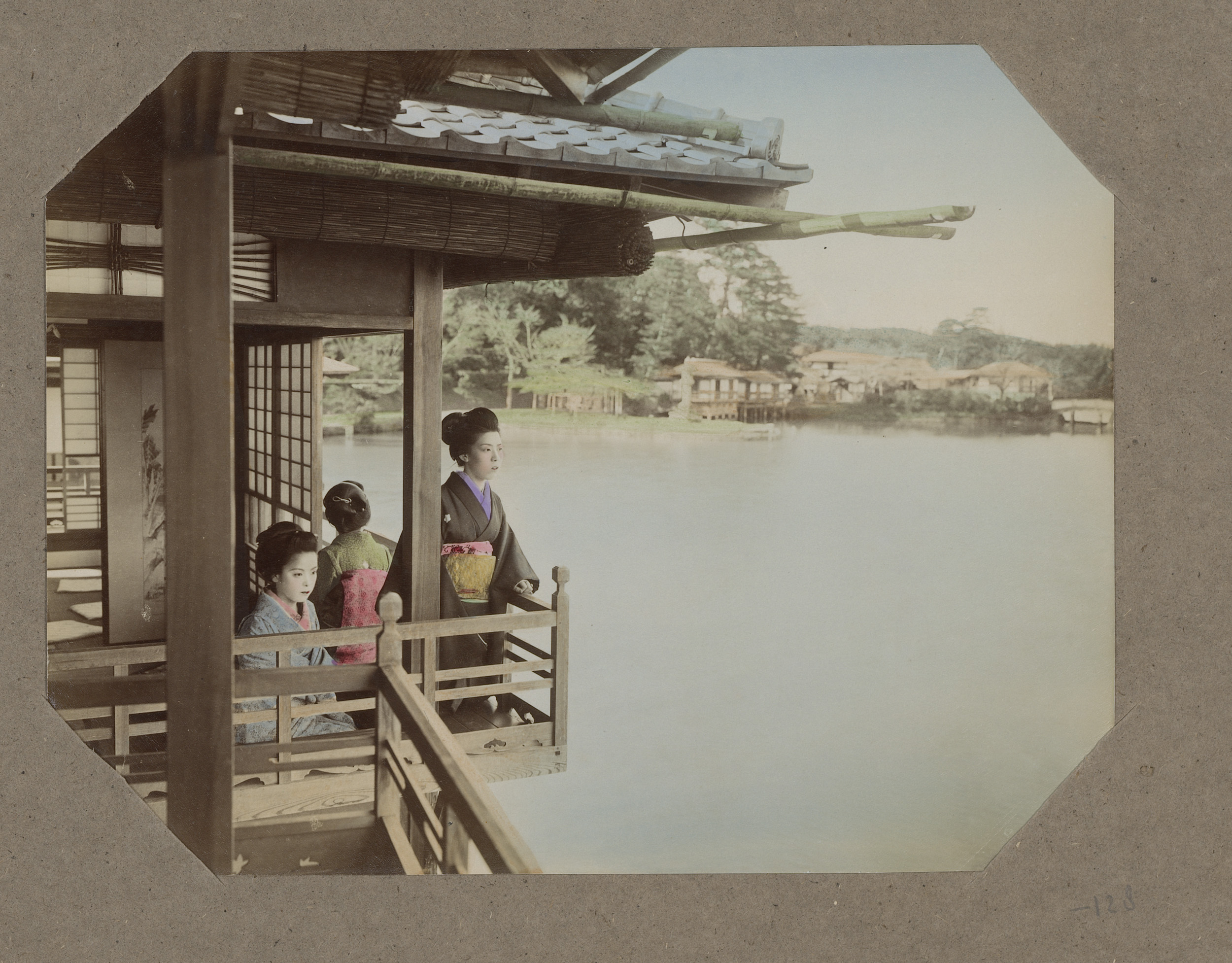 Drie vrouwen op een balkon, uitkijkend over een meer...