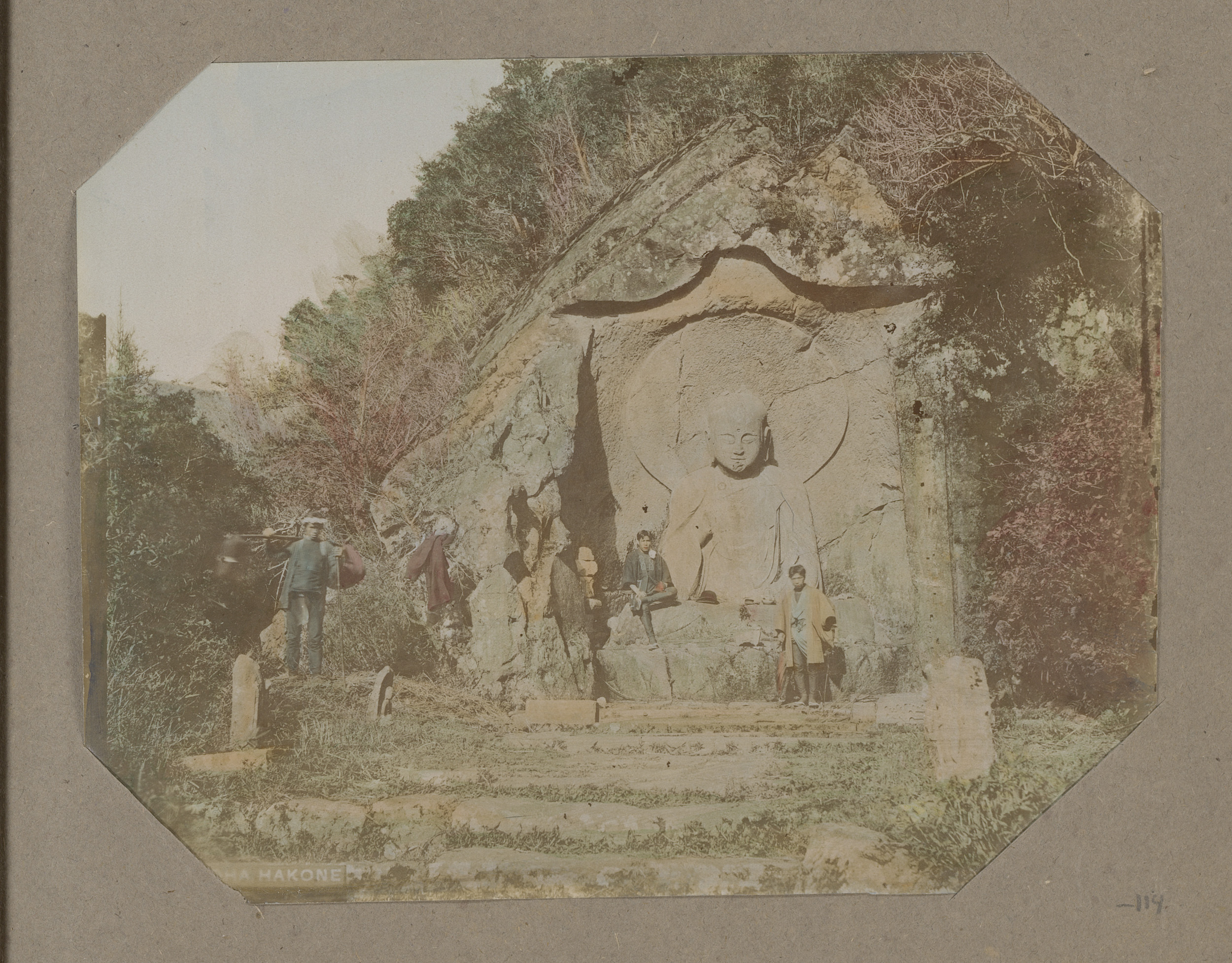 Drie mannen bij een reliëf met Boeddha in Hakone, Japan