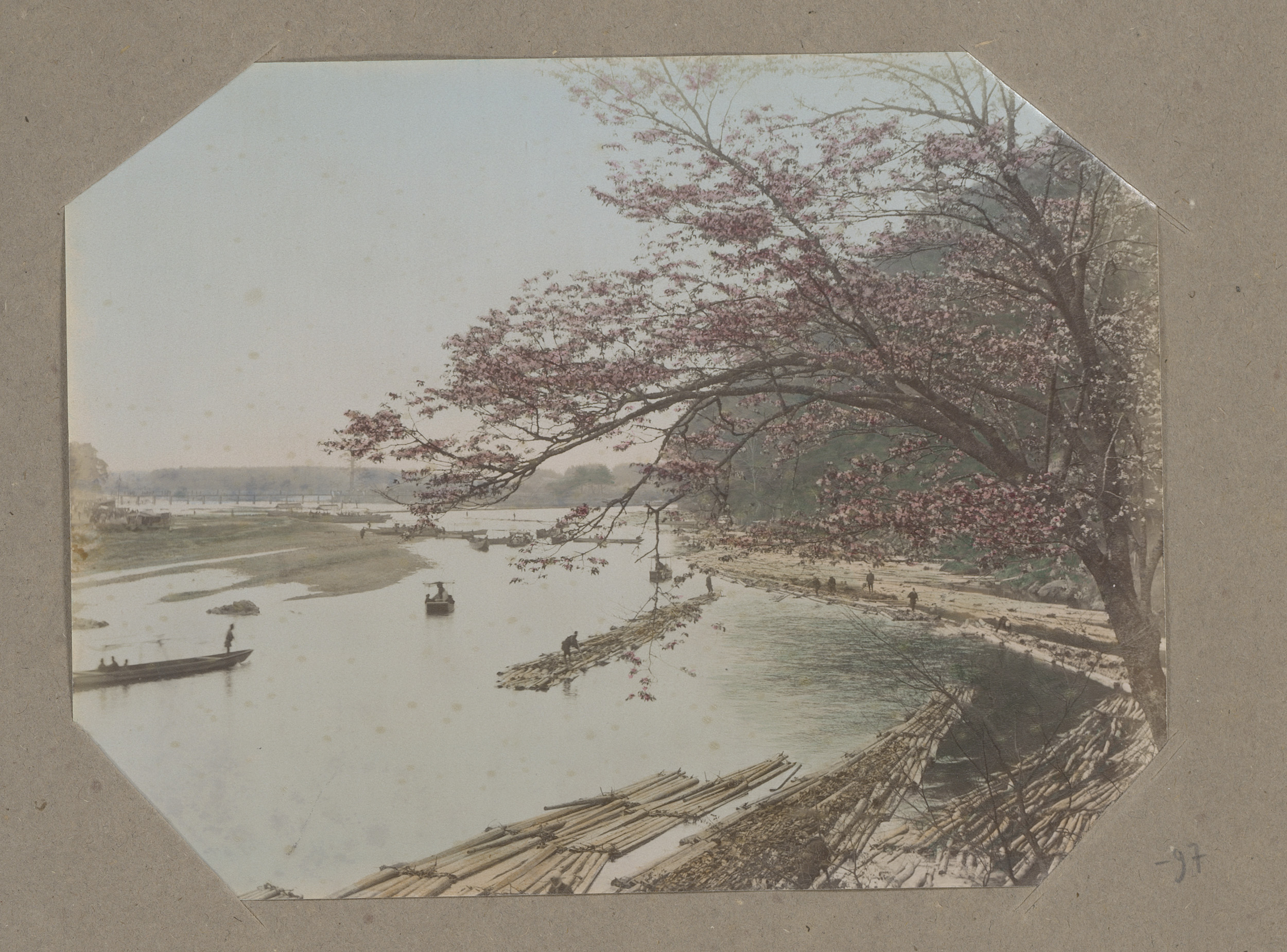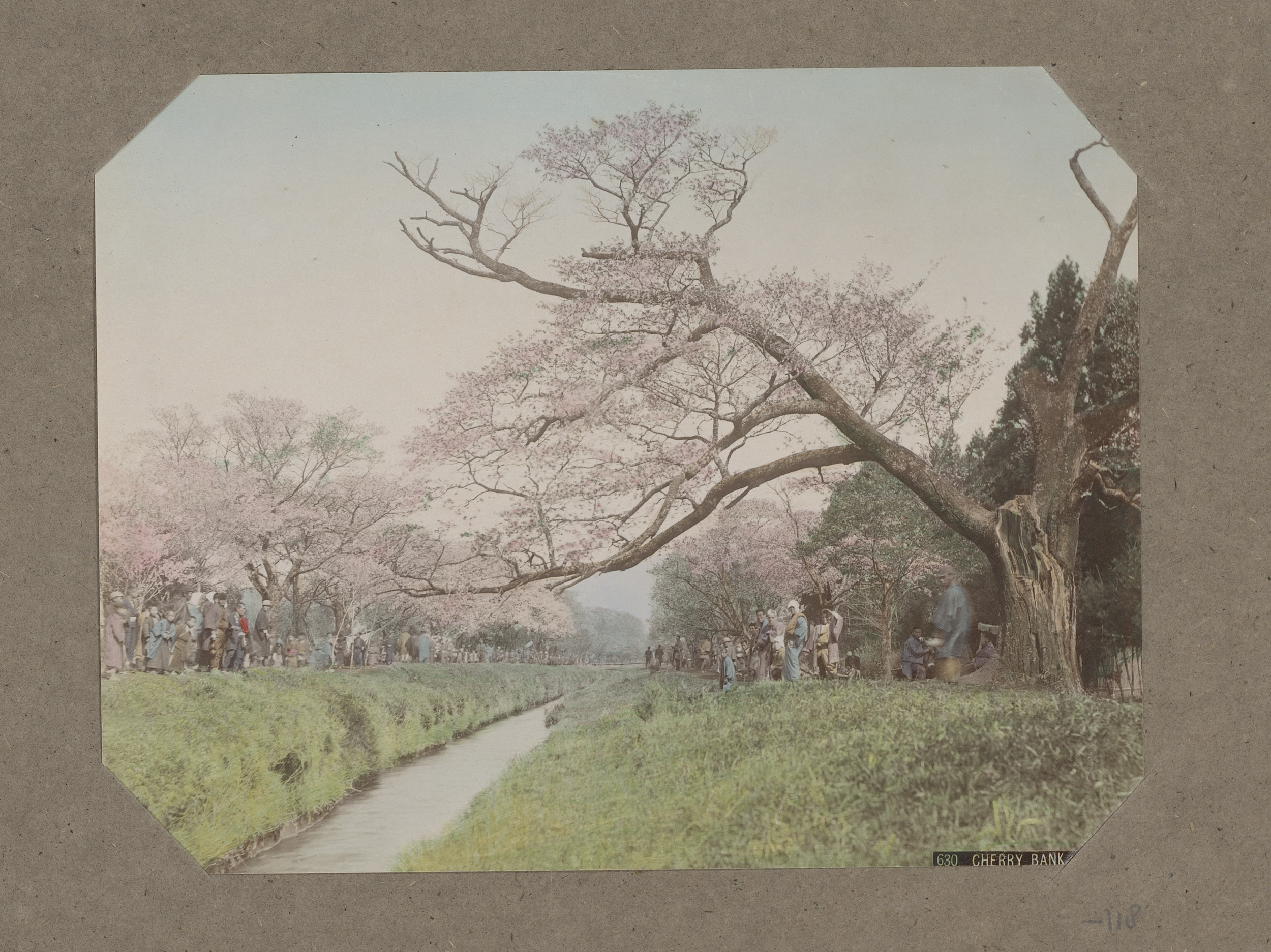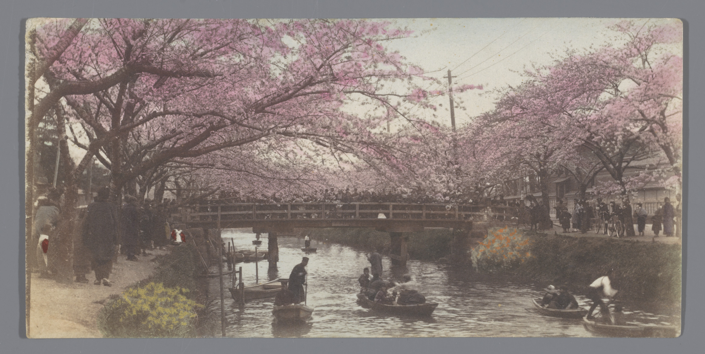 Mensen en kersenbloesem aan weerszijden van een beek...