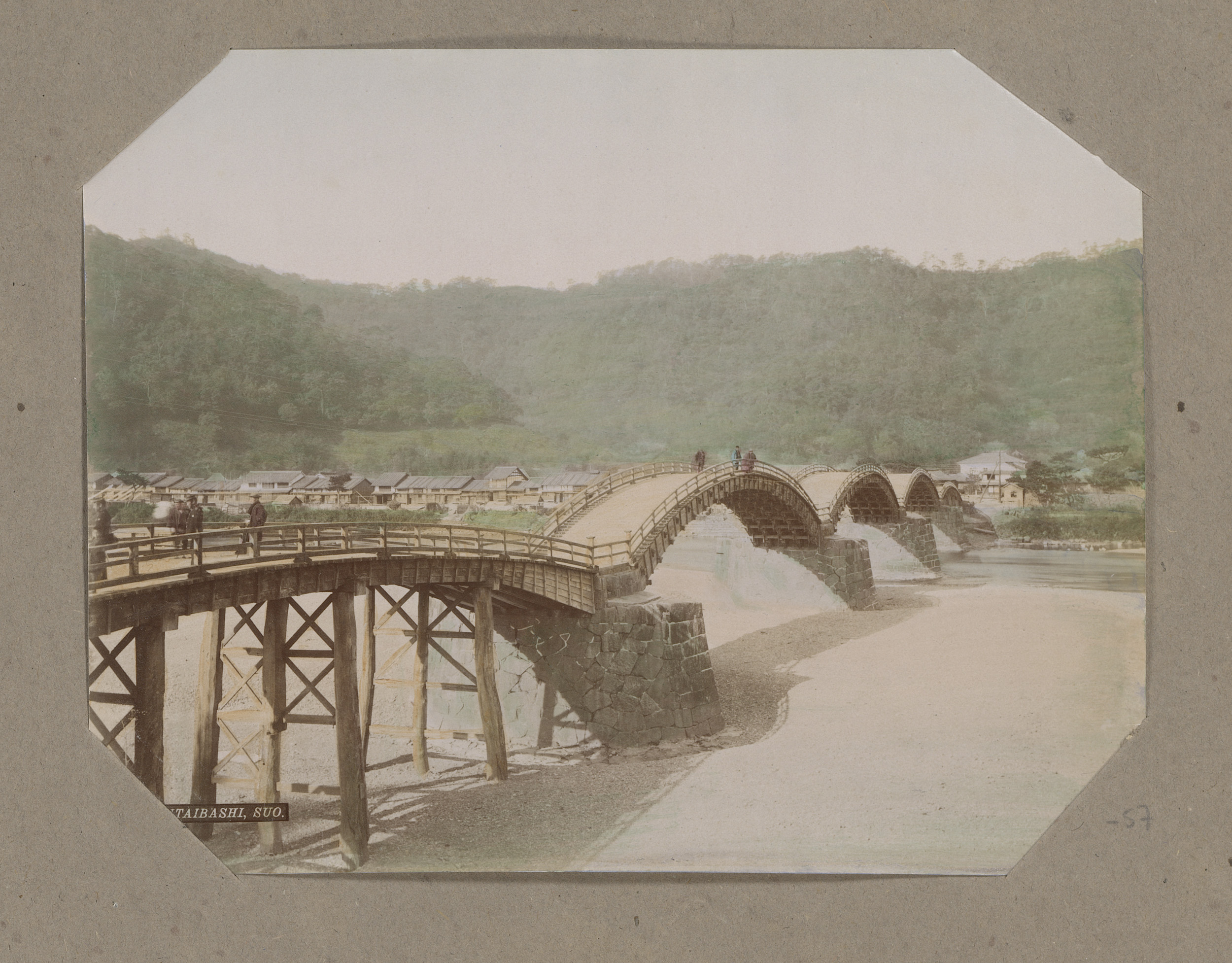 Gezicht op de Kintai-kyo brug over de Nishiki rivier...