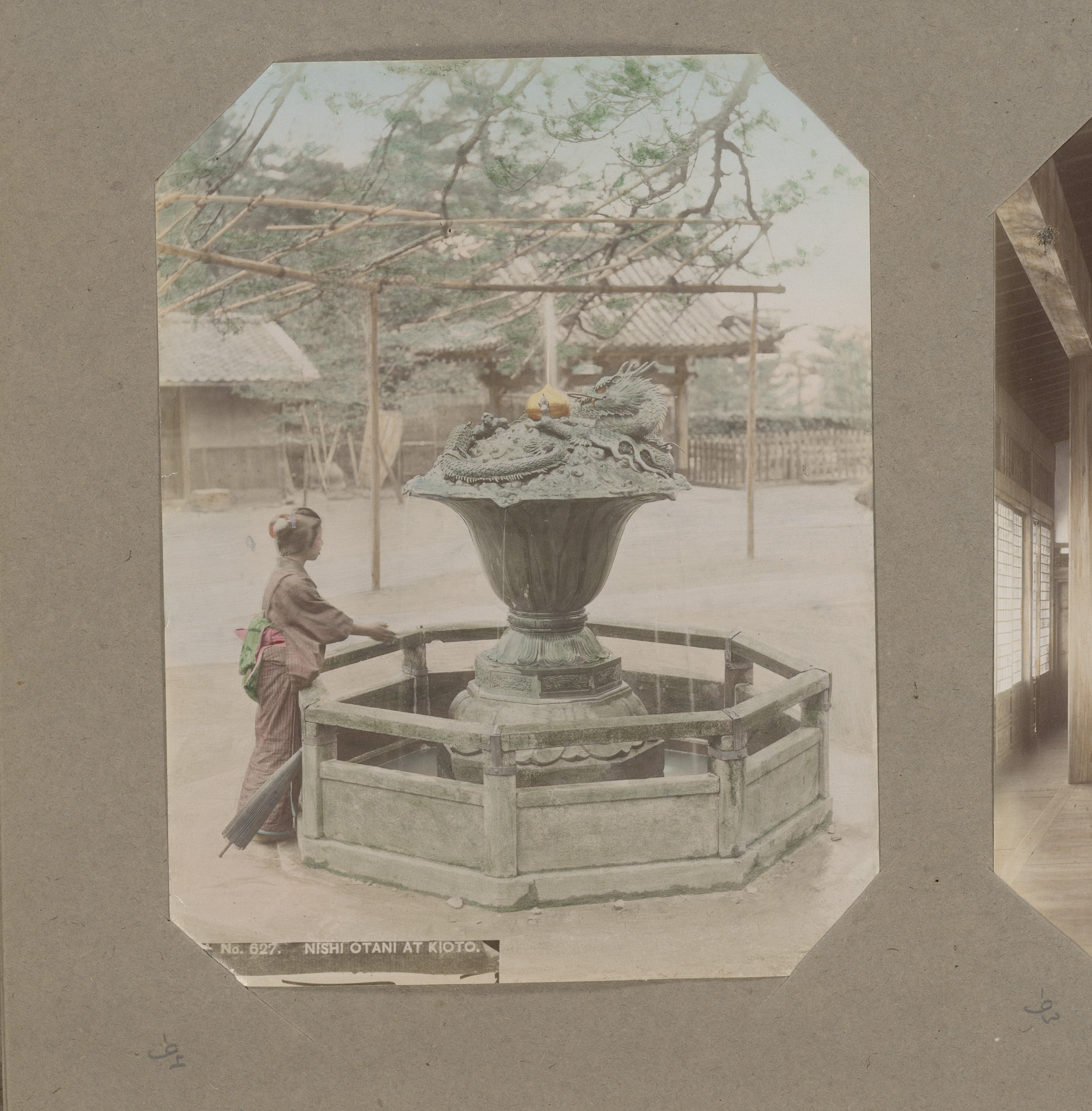 Vrouw bij een fontein in Nishi Otani, Kyoto, Japan