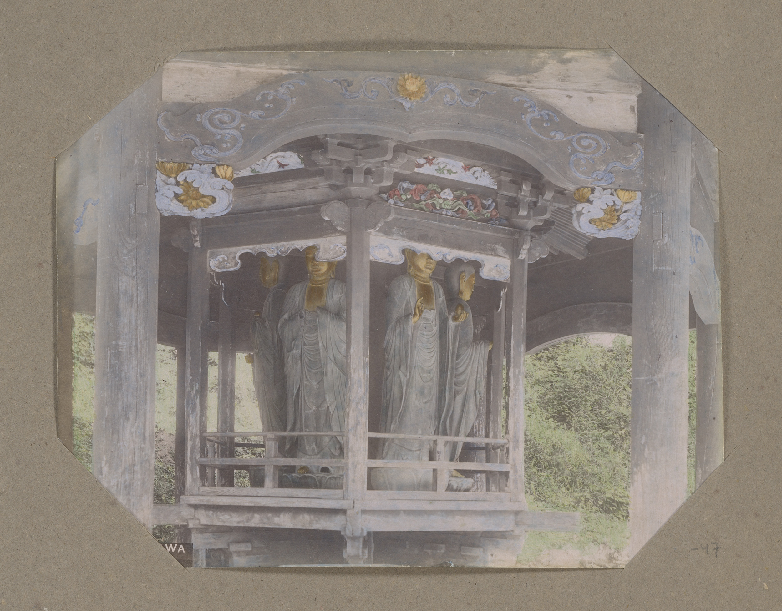 Vier sculpturen onder een afdak in Mizusawa, Japan