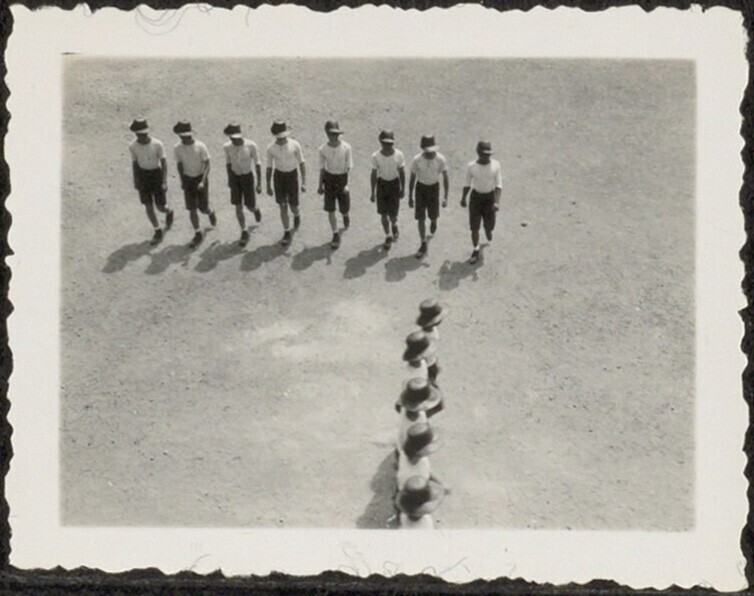 Training militairen of veldpolitie (?) in kazerne