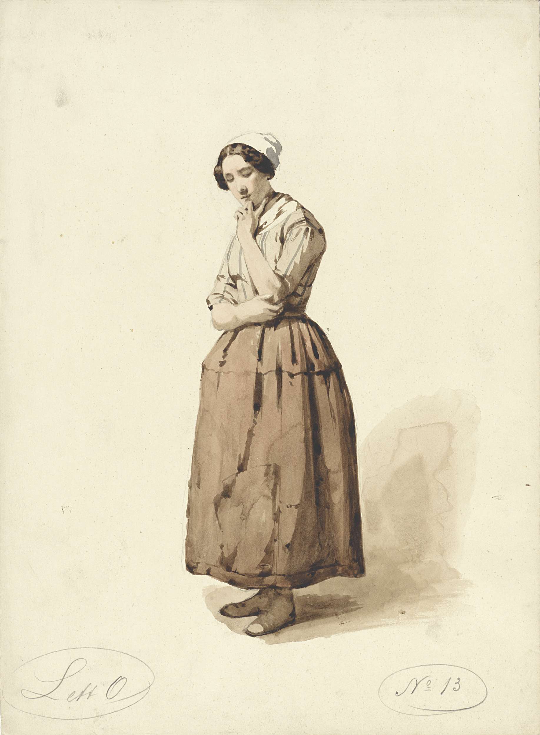 Staande peinzende vrouw, driekwart naar links