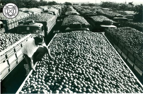 Vrachtwagen wordt geladen met net geoogste sinaasappels