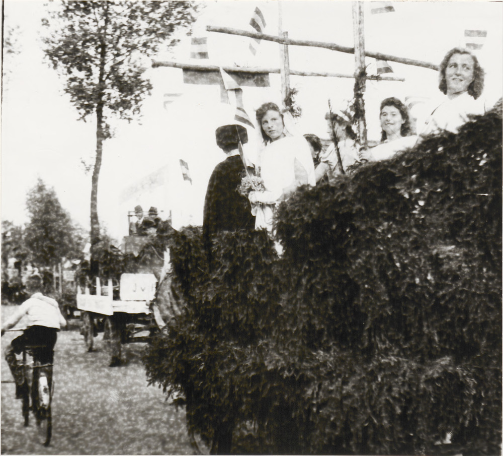 Bevrijdingsoptocht tijdens Oranjefeest, dames boven ...