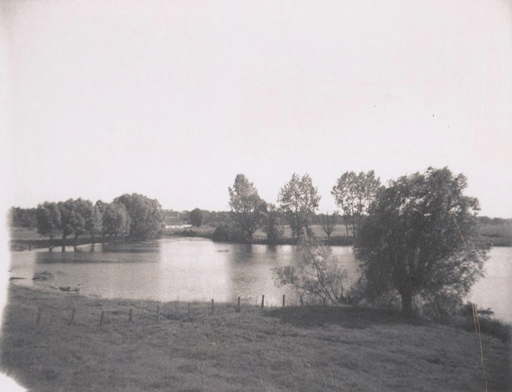 Grote plas met boerderij in de verte